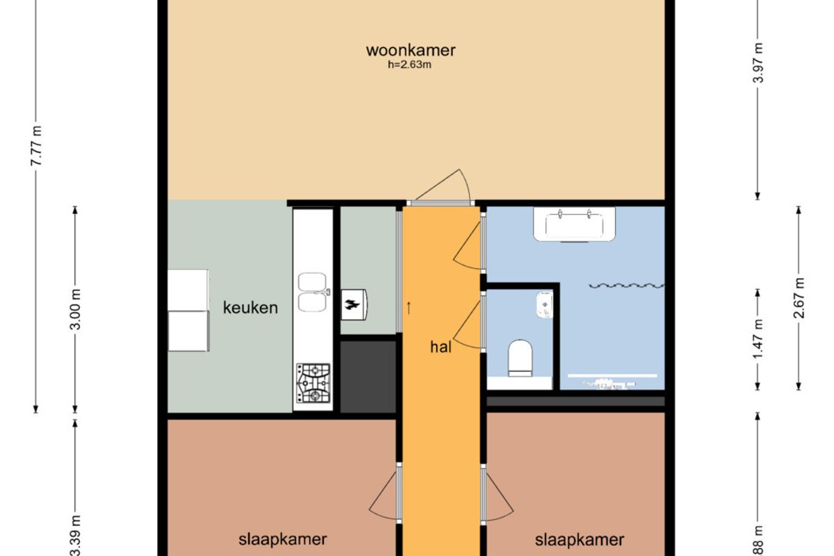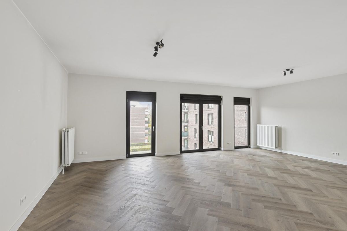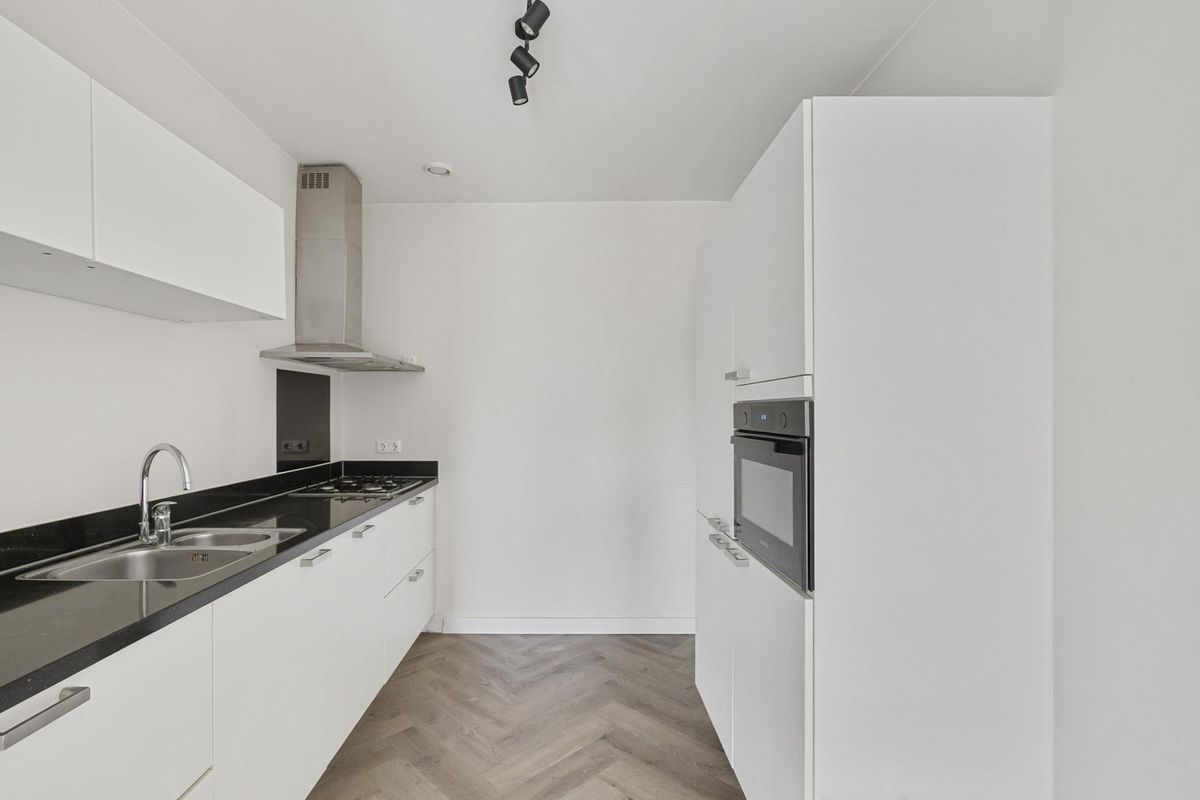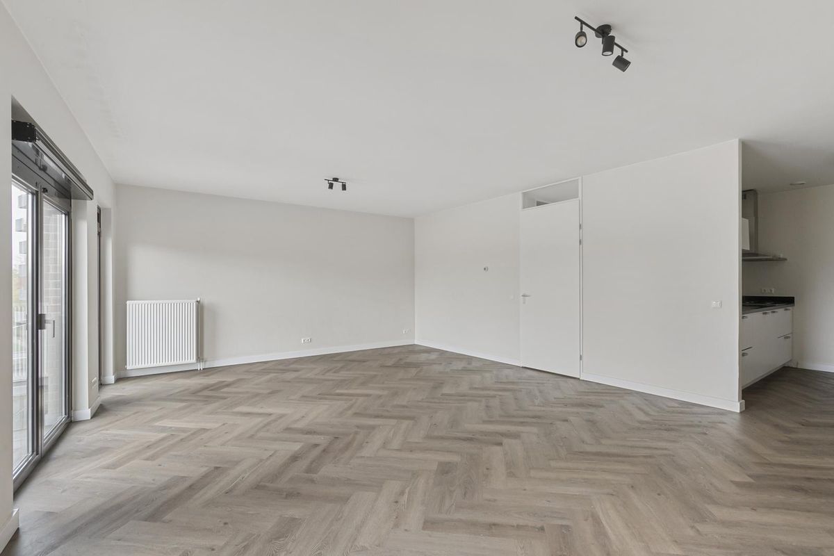 Een ruime woonkamer met open keuken voorzien van een gaskookplaat, afzuigkap, oven, koel-/vriescombinatie en een vaatwasser. De badkamer is uitgerust met een douche, een dubbele wastafel met verlichte spiegel en een designradiator. 2 slaapkamers gelegen aan de voorzijde van het appartement. Het gehele appartement is voorzien van een fraaie visgraatvloer.