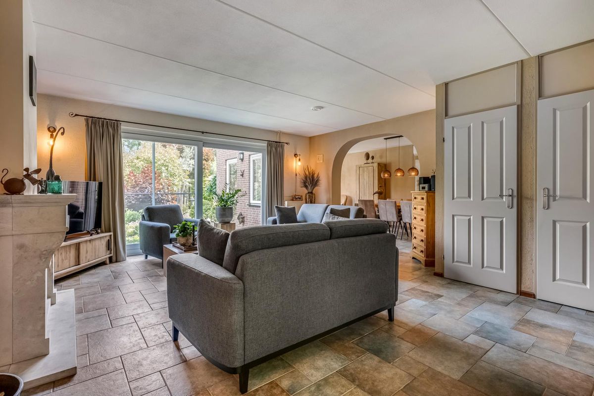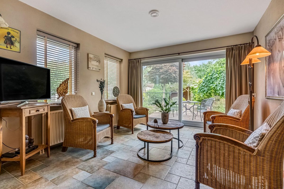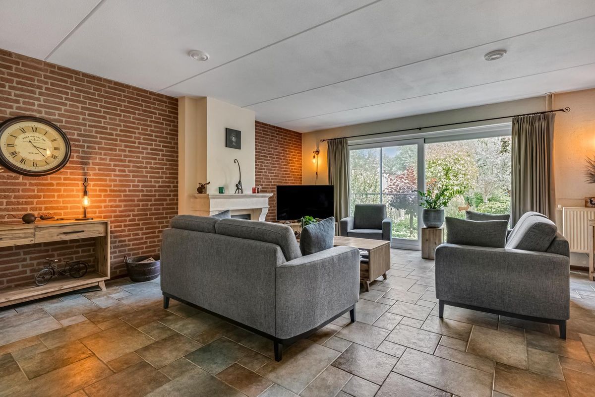 De uitbouw aan de achterzijde (2000) creëert extra leefruimte en maakt van de eetkamer een volwaardige tweede woonkamer, met eveneens een schuifpui richting de tuin. Overal ligt dezelfde kwalitatieve vloer, wat rust en eenheid brengt in het geheel.