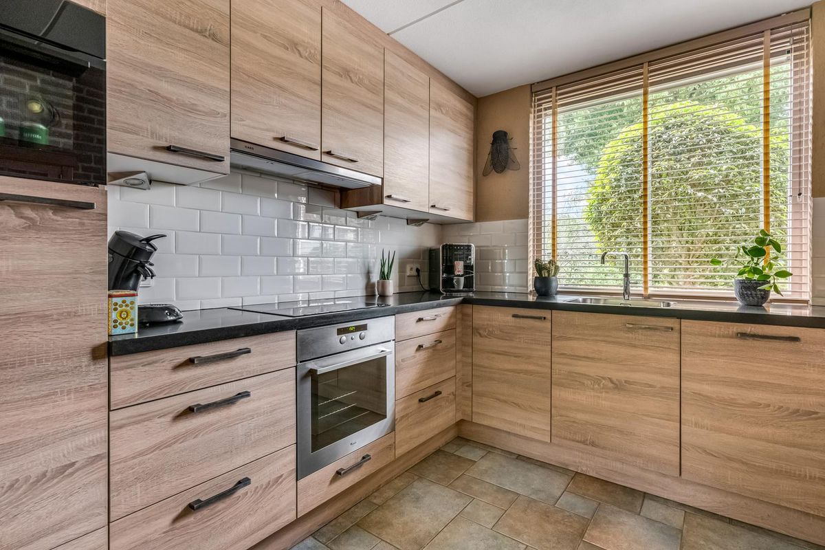 Aan de voorzijde vind je de halfopen keuken in een stijlvolle houtlook met zwarte accenten. De keuken is praktisch en modern ingericht met een donker stenen blad, handgevormde wandtegels, en luxe apparatuur, waaronder een inductiekookplaat met afzuiging, combi-oven, separate oven, Quooker, vaatwasser en spoelbak. Hier kook je met plezier, met volop kastruimte en uitzicht over de gezellige straat.