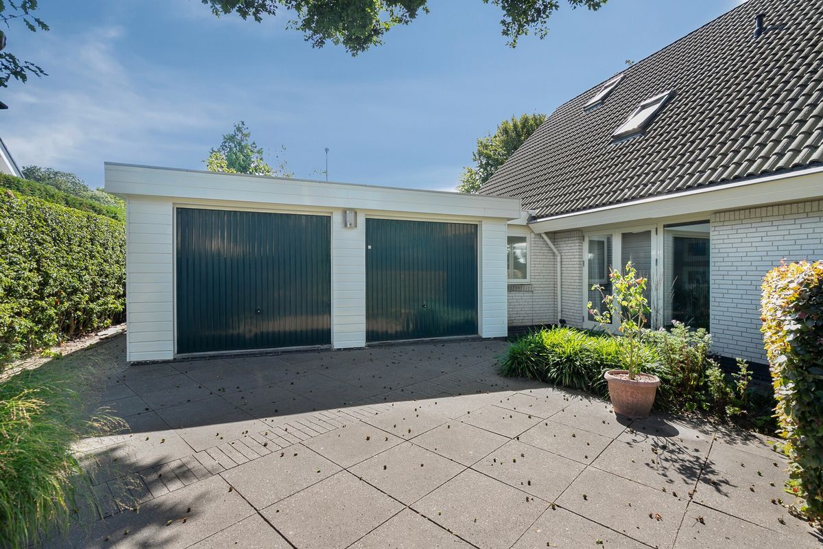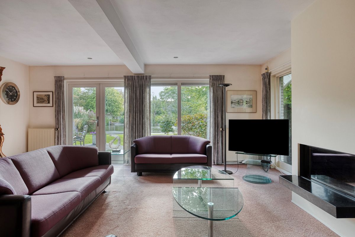 De woonkamer met open haard is tuingericht en heeft openslaande deuren naar zowel de achter- als de zijkant. Ook vanuit de woonkamer kunt u -via dubbele deuren- naar de eetkamer. Deze royale kamer -ook met openslaande deuren- is ideaal voor gezellige diners en familiebijeenkomsten. De met deze kamer verbonden keuken is van veel gemakken voorzien o.a. 5-pits gasstel, koel-/vriescombinatie (2021), vaatwasser, combi-oven/magnetron (2022), oven (2010), afzuigkap (2021) en vanwege de situering kunt u al kokend uitkijken over de tuin en het water. Grenzend aan de keuken zit de praktische bijkeuken met praktische uitstortgootsteen en grote vriezer (6 laden), deze heeft een deur naar de achtertuin. Ook is hier de opstelplaats voor de cv-ketel. De dubbele garage die vanuit de bijkeuken is te bereiken bevindt zich aan de zijkant van de woning.