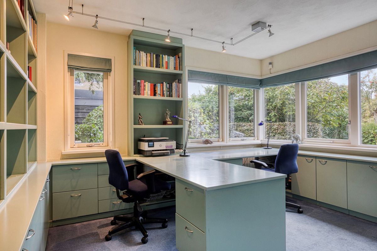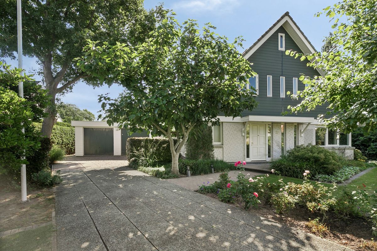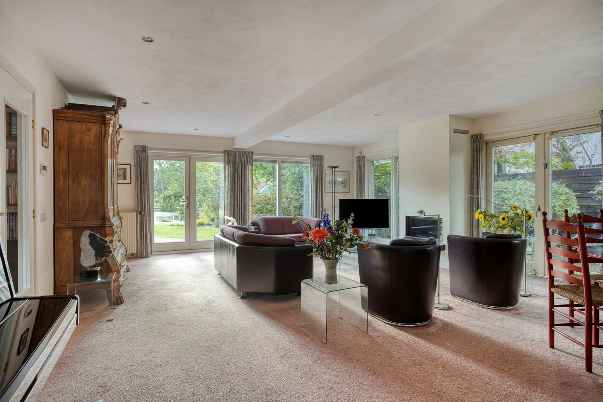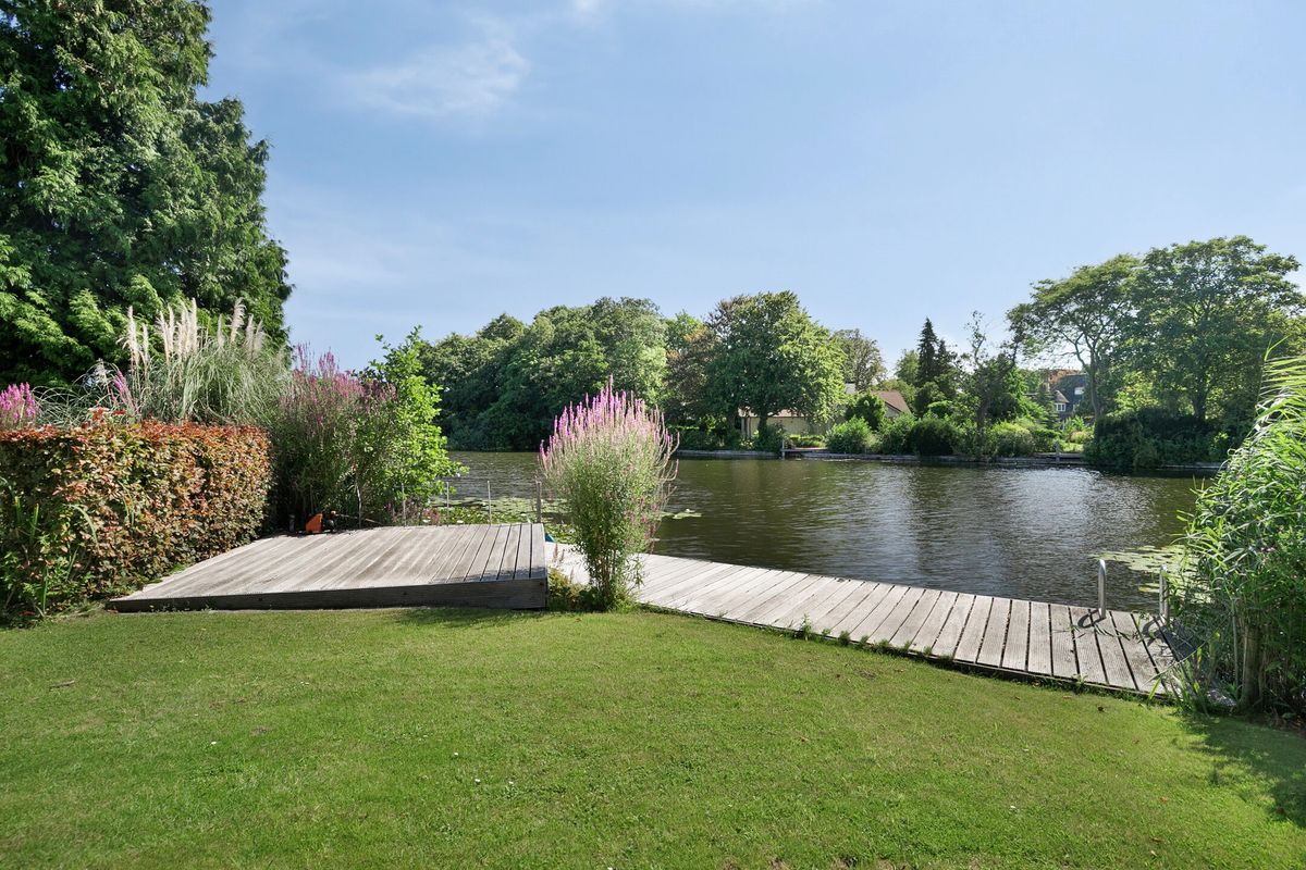 Spacious detached villa (223 m² living area) in a prime location in the desirable Clinckenburgh neighborhood. The property features 5 bedrooms, 3 sets of double French doors leading outside, 3 sets of double French doors inside, 3 toilets, 2 bathrooms, separate dining and study rooms, a bright living room with a fireplace, a double integral garage, a utility room, 10 solar panels, and a private jetty on the Poelmeer waterway (connecting you to the Kagerplassen lakes and Leiden). There is ample parking on the property for several cars (3 outdoors and 2 covered), and the villa boasts a beautifully landscaped garden with several terraces. The total plot size is 1915 m², of which approximately 672 m² is Poelmeer water. The sunny, beautifully landscaped back garden is approximately 24 meters long and 25 meters wide.