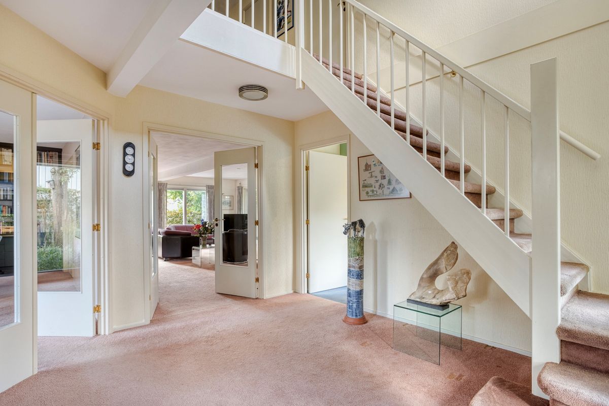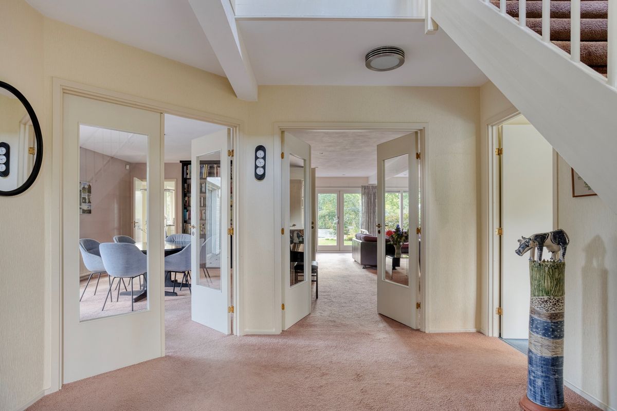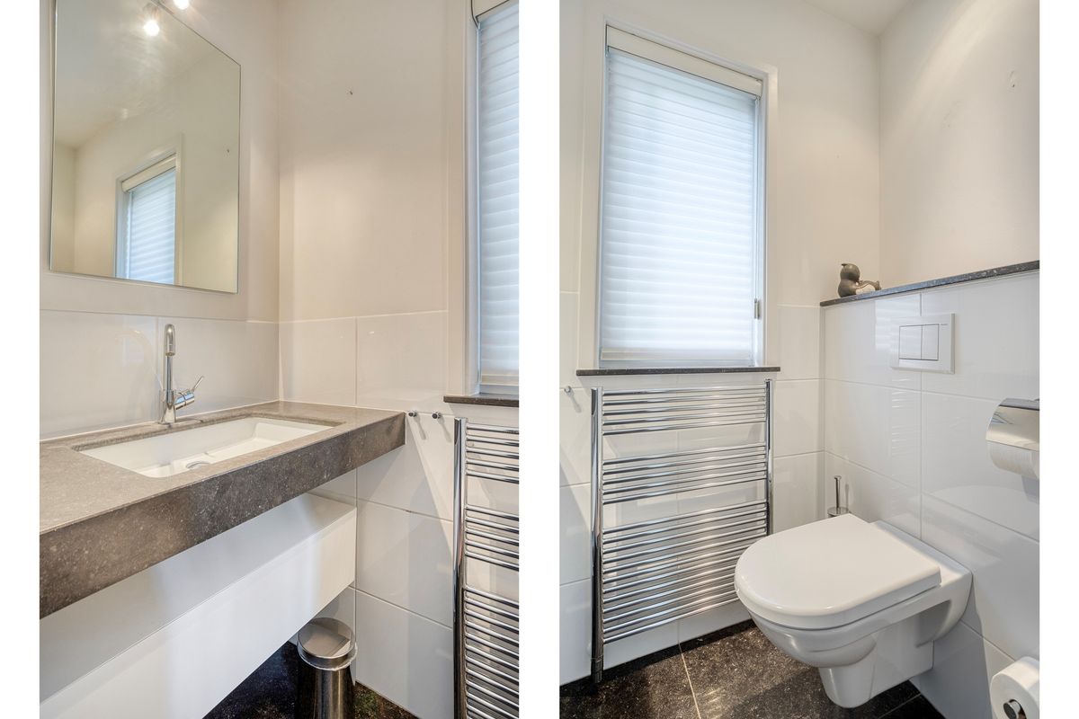 Upon entering the house, you have a spacious hall with a mezzanine. On the left are the meter cupboard, a modern wall-hung toilet (2010) with washbasin (unit), designer radiator, and coat closet. On the right, you'll find the stairs to the first floor. The dining room, living room, and study are accessible from the hall.