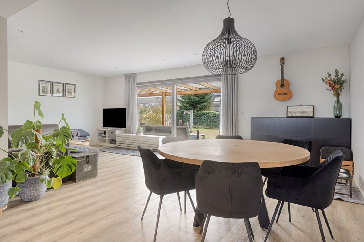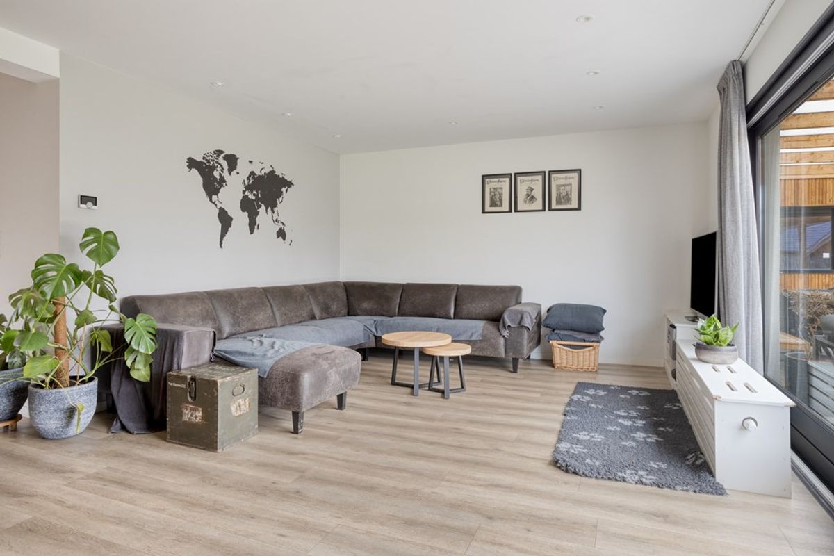• De living: Een lichte, royale woonkamer met een directe verbinding naar de open keuken. Dankzij de schuifpui aan de achterzijde loopt binnen naadloos over in het buitenleven op het overdekte terras.