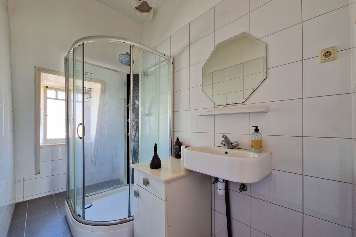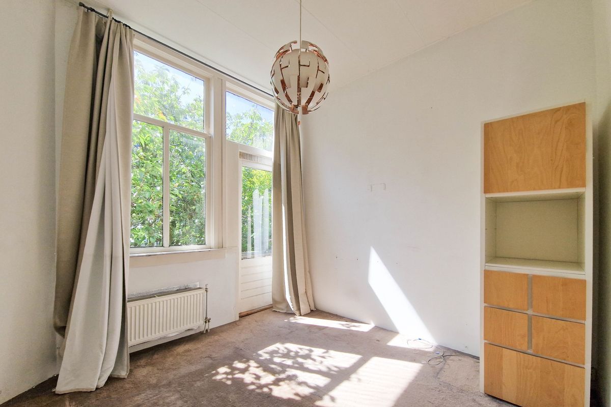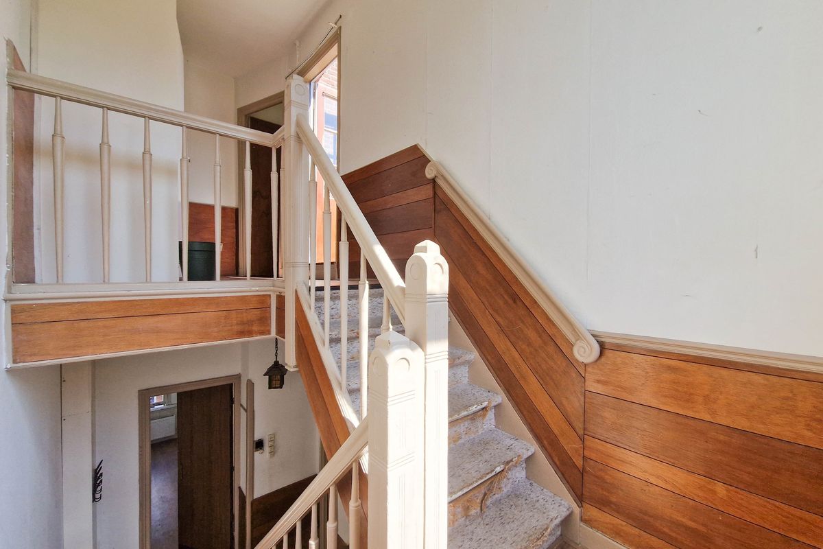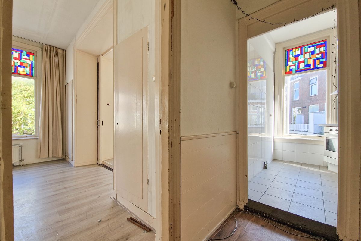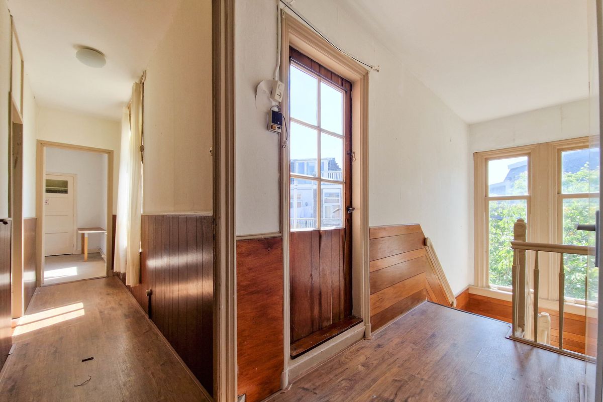 Eigen entree vanaf de straat met hal, berging en trapopgang naar de eerste verdieping. Op deze verdieping bevindt zich een ruime overloop met toilet, een gesloten keuken aan de voorzijde en een royale woon- en eetkamer, gescheiden door de originele en-suite deuren. Aan de achterzijde ligt een slaapkamer met toegang tot het balkon en een bijkeuken met aansluiting voor de wasmachine.
