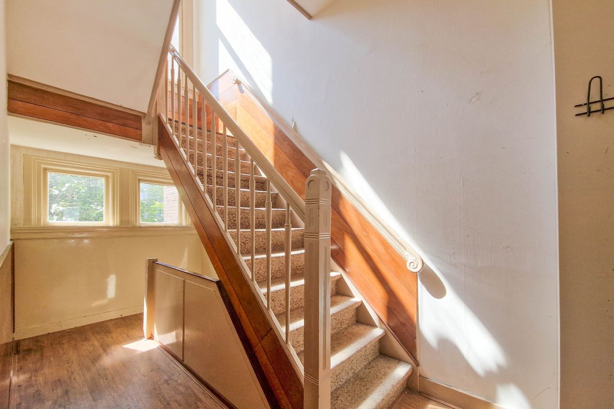 Private entrance from the street with hallway, storage area, and staircase to the first floor.