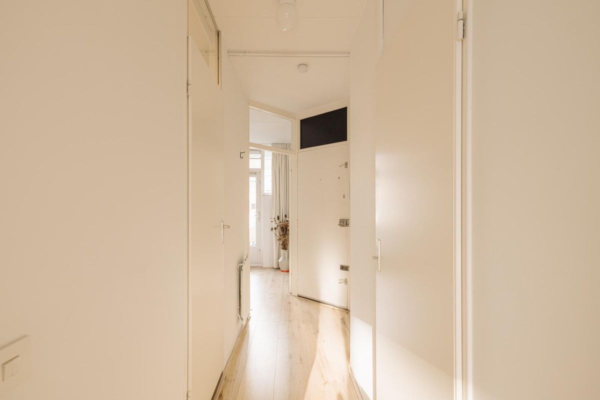 Via het ruime en verzorgde gemeenschappelijke trappenhuis bereik je de entree op de eerste verdieping. De hal biedt toegang tot alle vertrekken. Aan de voorzijde ligt de sfeervolle woonkamer met erker, waardoor er extra veel daglicht binnenvalt en je uitkijkt op de levendige Dappermarkt. De ruimte is praktisch in te delen en sluit mooi aan op de moderne open keuken. Aan de achterzijde bevindt zich de slaapkamer, die toegang geeft tot het zonnige balkon. Vanaf hier loop je door naar het gemeenschappelijke terras en de binnentuin. Door de gunstige ligging in het blok voelt dit terras als een ruim privébuitengedeelte. De nette badkamer ligt tussen de woon- en slaapkamer en is voorzien van een inloopdouche, wastafelmeubel, toilet en wasmachineaansluiting. Vanuit de hal is bovendien een handige bergkast bereikbaar. Op de begane grond beschik je tenslotte over een eigen berging.