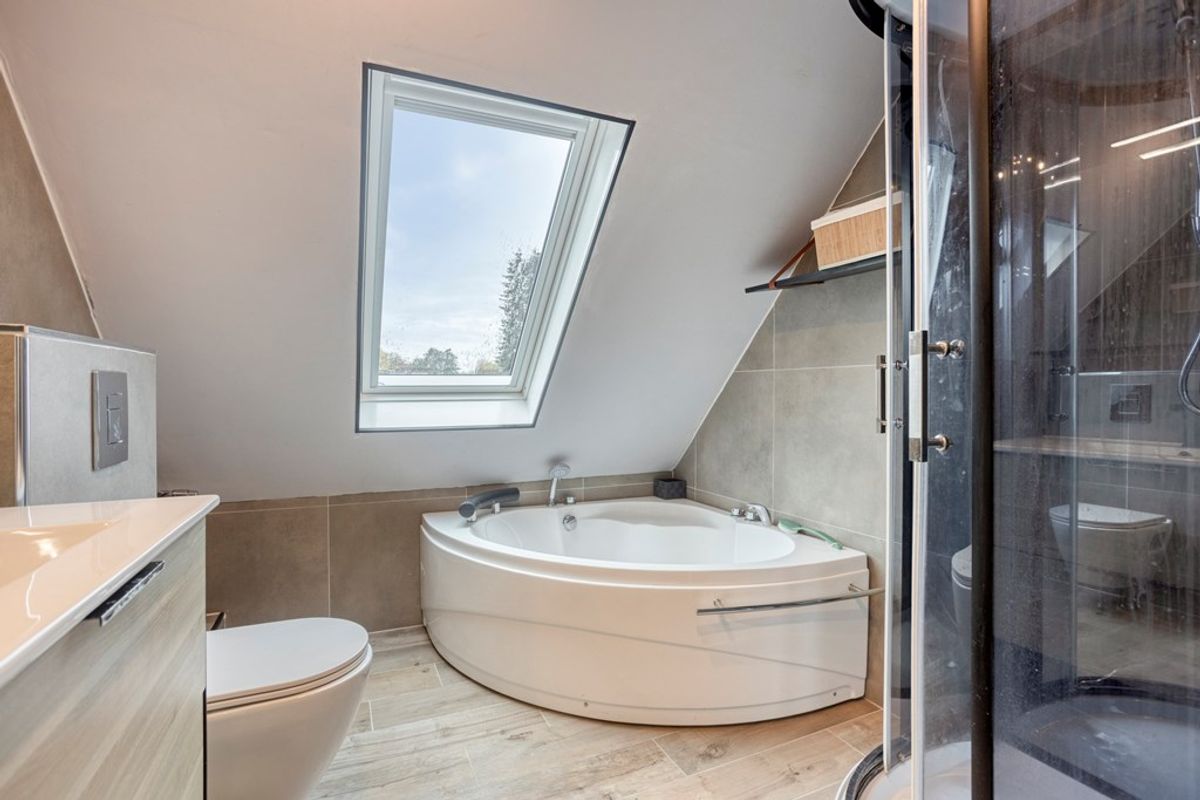 Op de eerste verdieping bevinden zich drie slaapkamers van verschillende afmetingen. De hoofdslaapkamer ligt aan de voorzijde en biedt gemakkelijk ruimte aan een groot tweepersoonsbed en een royale kledingkast. De twee overige kamers zijn ideaal als kinderkamer, logeerkamer of thuiskantoor. De badkamer is modern afgewerkt en compleet uitgerust met een hoekligbad, luxe douchecabine, tweede toilet en wastafelmeubel. Dankzij het dakraam valt er veel daglicht naar binnen, wat de ruimte fris en uitnodigend maakt.