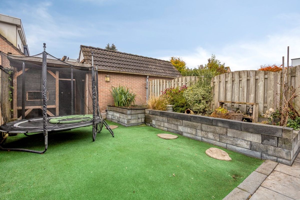 De achtertuin is een fijne verrassing: diep, verzorgd en gunstig gelegen op het zuidwesten. Hier geniet u van veel zon en privacy, met ruimte voor een grote eettafel, een loungehoek en speelruimte voor kinderen. De tuin is grotendeels onderhoudsarm aangelegd, met een betegeld terras, kunstgras en verhoogde plantenbakken. Achterin vindt u een praktische stenen berging en een overkapping voor fietsen of tuinmeubilair. De tuin is tevens bereikbaar via een achterom. Ook aan de voorzijde is gedacht aan sfeer en gemak: een nette voortuin met eveneens verhoogde plantenbakken zorgt voor een vriendelijk aanzicht aan de straatzijde.