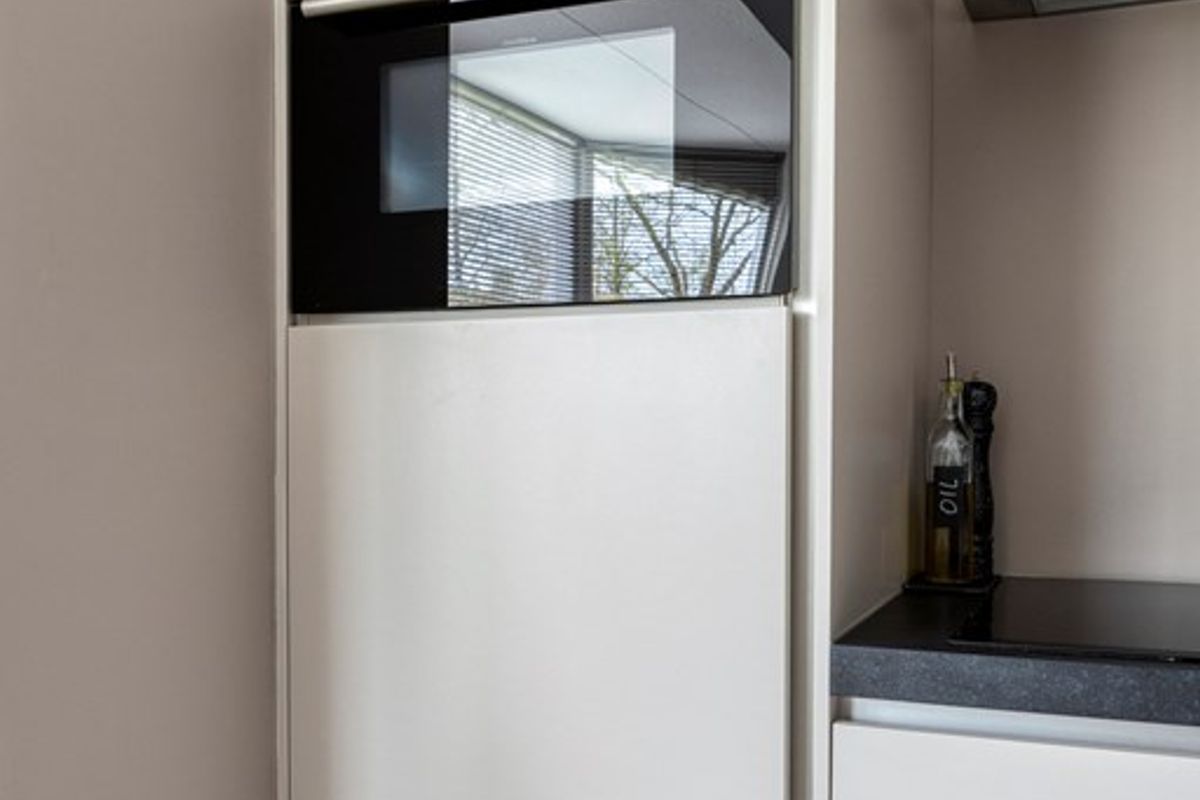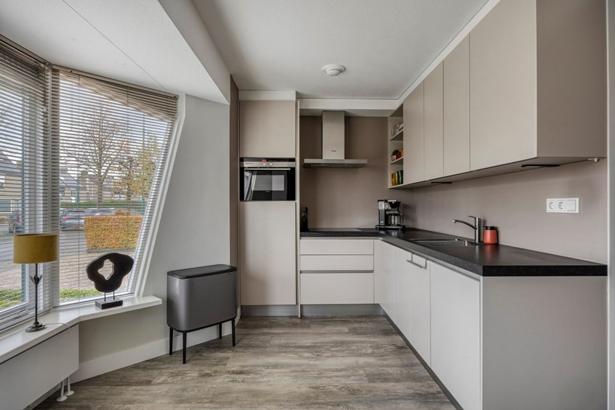 Aan de voorzijde van de woning bevindt zich de moderne, functioneel ingerichte keuken. De L-vormige opstelling zorgt voor een prettige werkruimte en biedt plaats aan diverse inbouwapparatuur, waaronder een inductiekookplaat met afzuigkap, oven, vaatwasmachine, spoelbak met kraan en een koelkast. De vele lades en kastjes bieden voldoende opbergruimte, terwijl u dankzij het raam een fijn uitzicht heeft over de rustige straat. Een keuken die praktisch is én met smaak is afgewerkt.