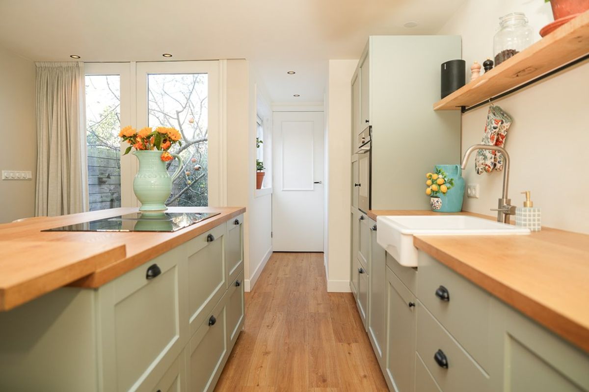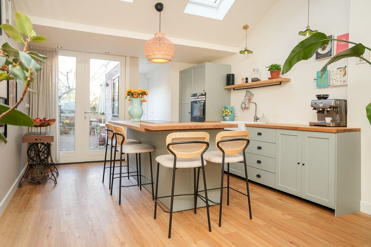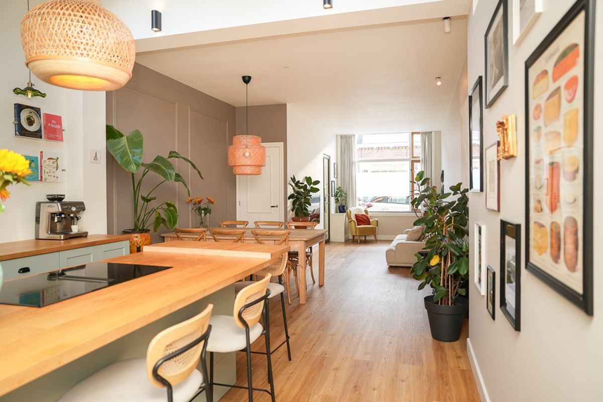 Volledig gerenoveerde en geïsoleerde woning (2022) voorzien van vloerverwarming. Moderne open keuken, stijlvol kookeiland en twee openslaande deuren naar de tuin.