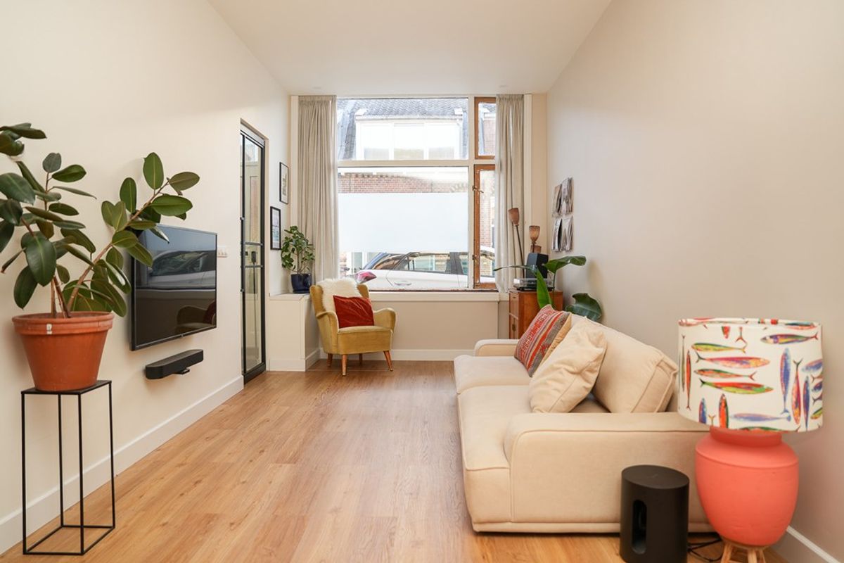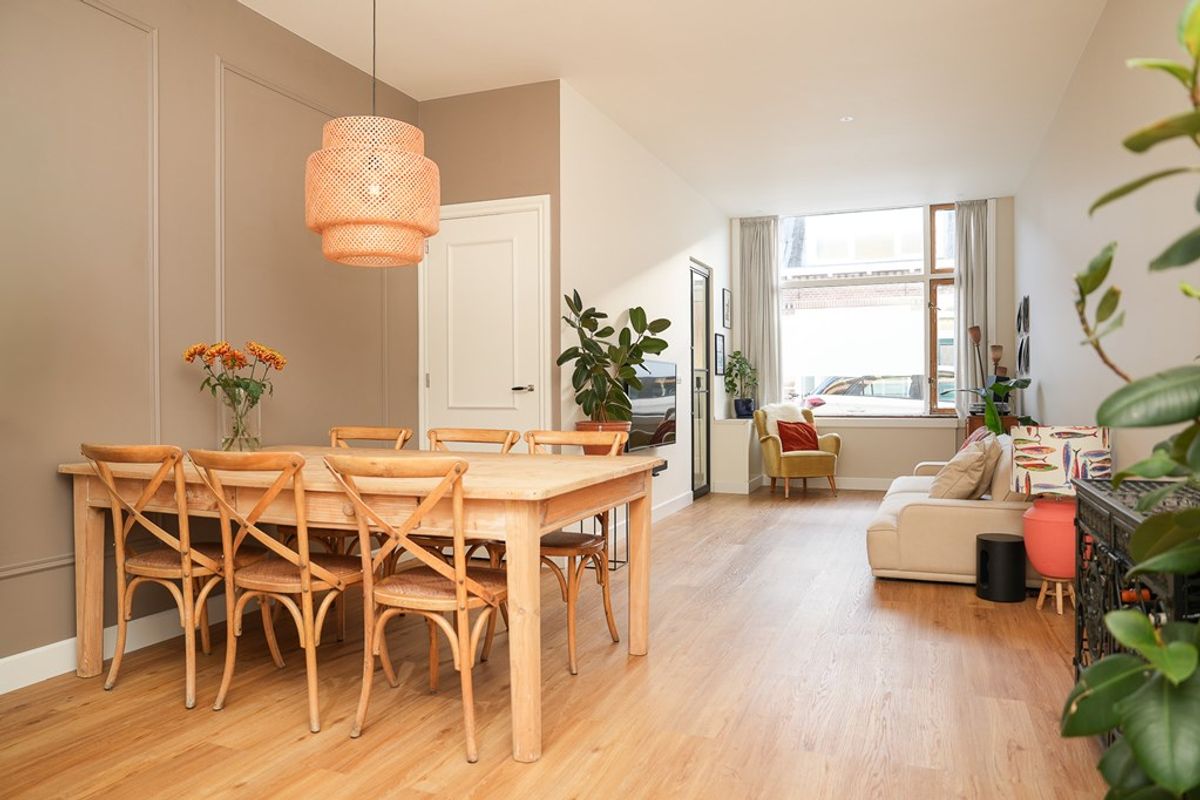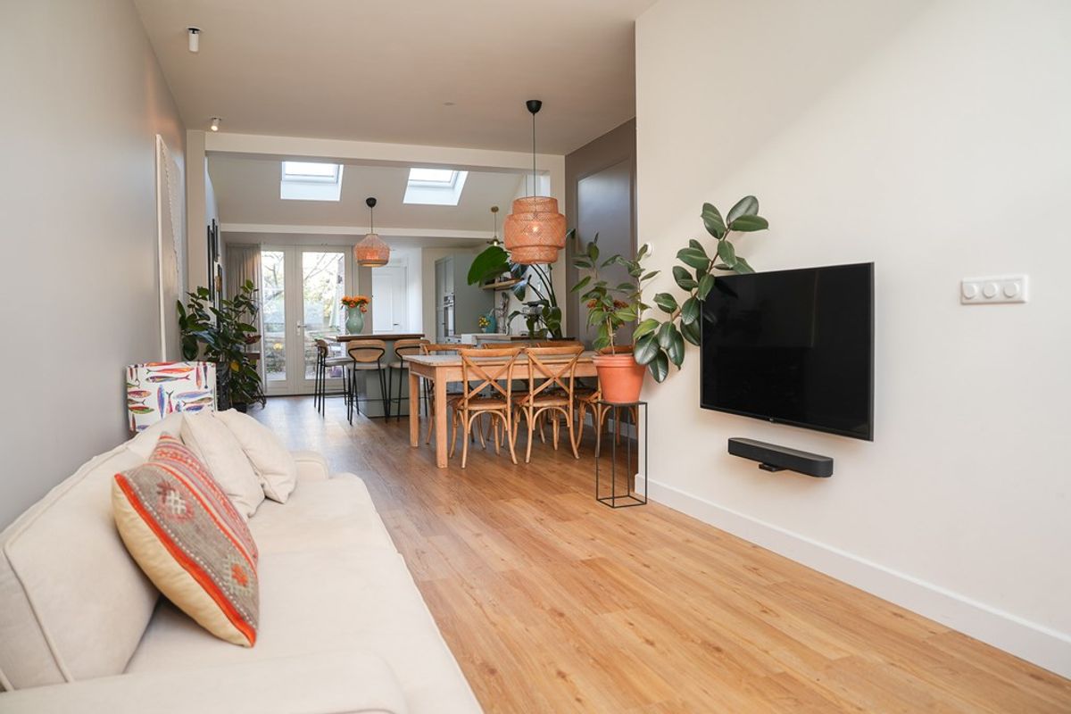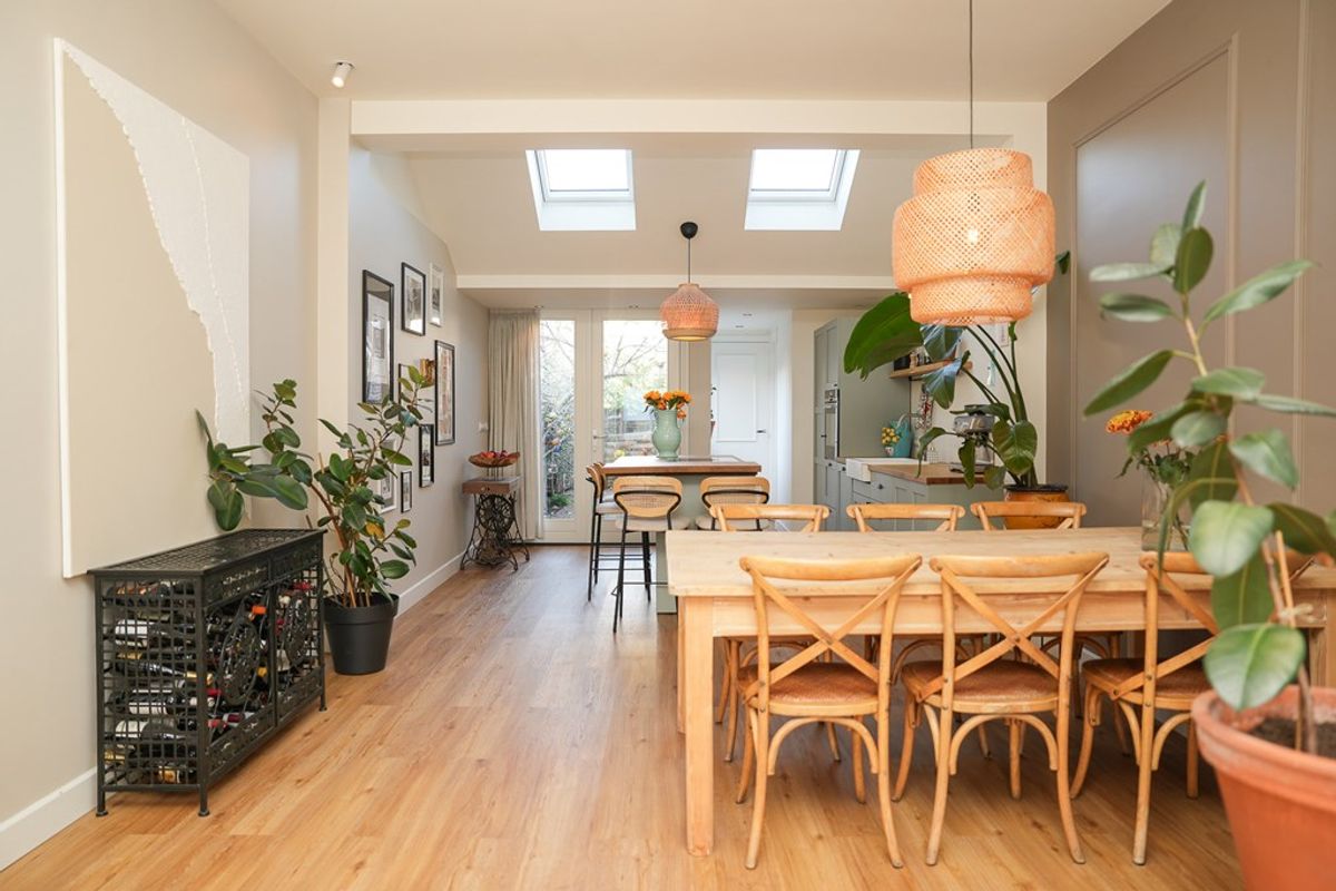 Volledig gerenoveerde en geïsoleerde woning (2022) voorzien van vloerverwarming. Moderne open keuken, stijlvol kookeiland en twee openslaande deuren naar de tuin.