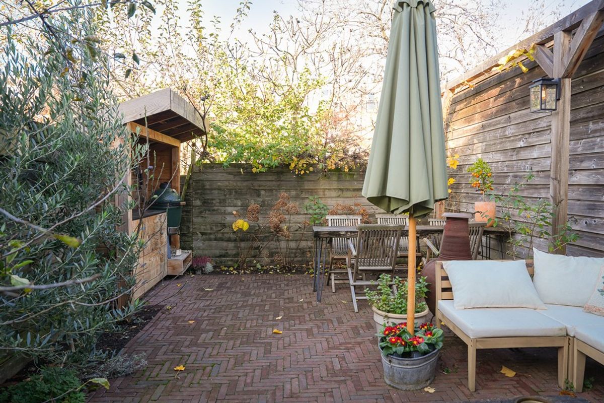 De ruime tuin is toegankelijk via de openslaande deuren in de keuken. De tuin is verrassend praktisch ingericht en biedt naast comfort ook veel groen in de vorm van fruitbomen en druivenstruiken. Achterin de tuin staat een loungehoek en een kleine buitenkeuken. Daarnaast is er voldoende plek voor een eettafel.