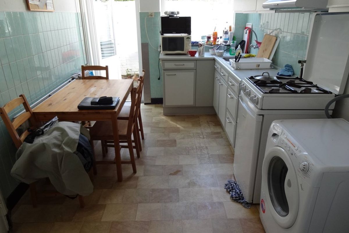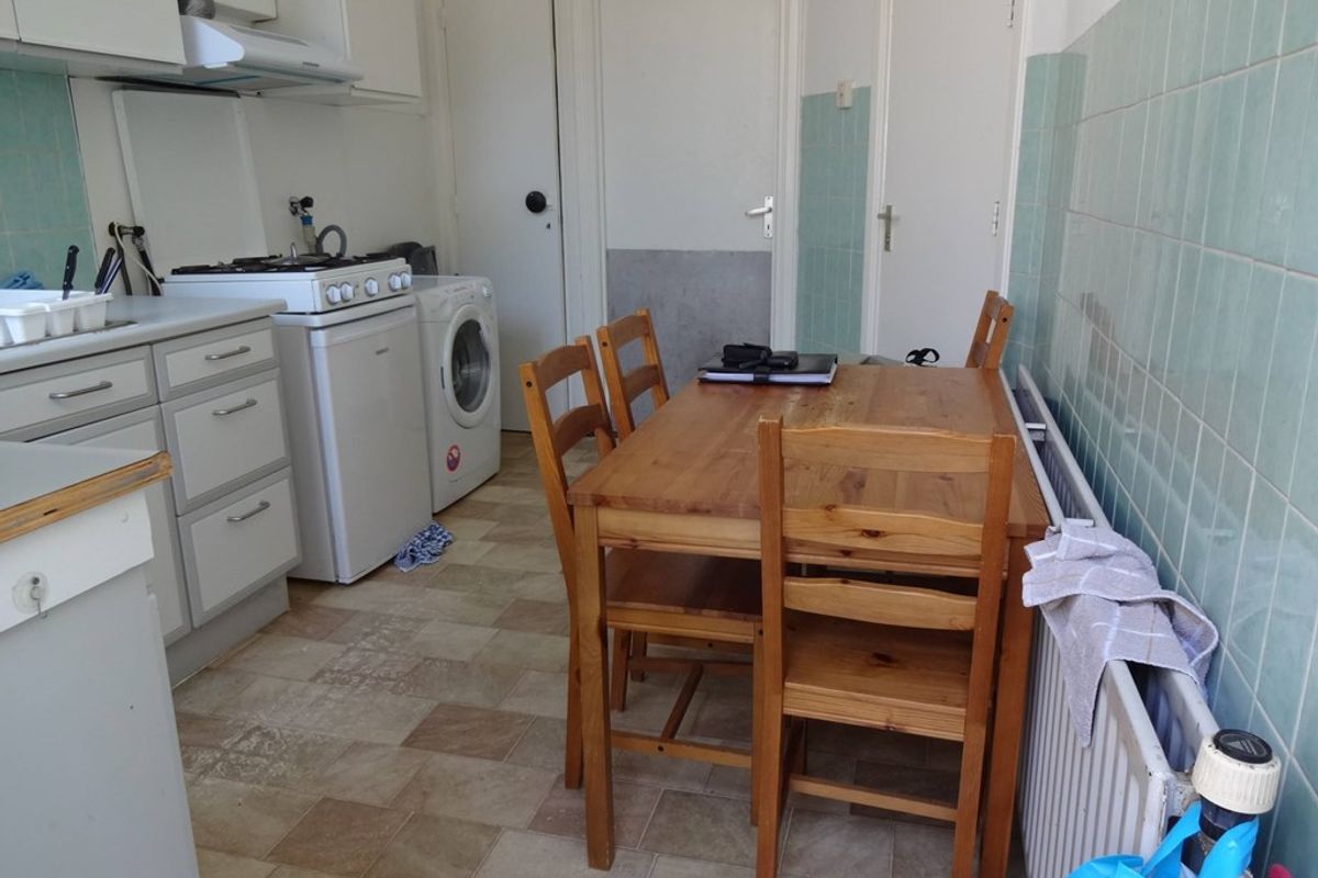 De keuken wordt gedeeld met 5 mede studenten, de keuken is voorzien van een 4-pits kookplaat, afzuigkap, combi magnetron, spoelbak met fontein en een tafel met 4 stoelen. Tevens bevind zich in de keuken de gezamenlijke wasmachine.