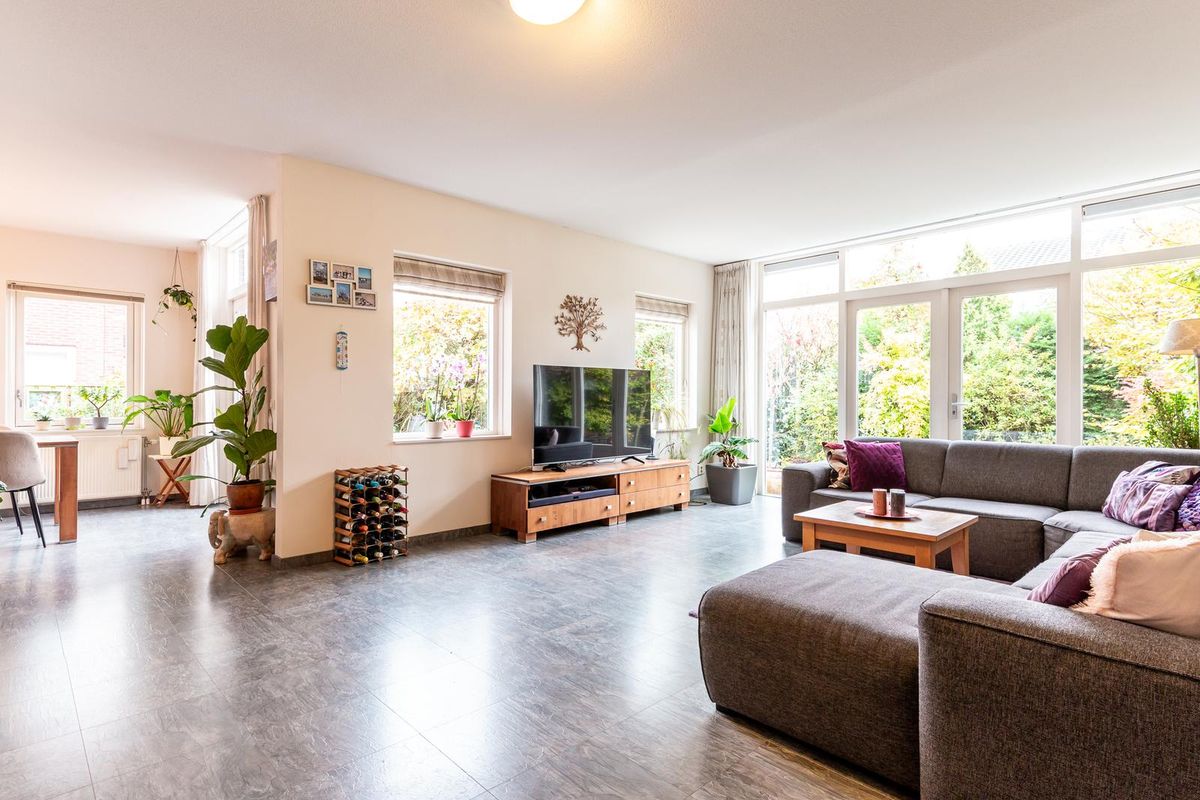 De woonkamer ligt aan de achterzijde van de woning en is dankzij de vele raampartijen aan de achter- en zijkant een heerlijke, lichte leefruimte. Vanuit de zithoek kijk je prachtig uit over de riante, fraai aangelegde achtertuin een plek waar je volop privacy ervaart en waar elk seizoen zijn charme heeft.