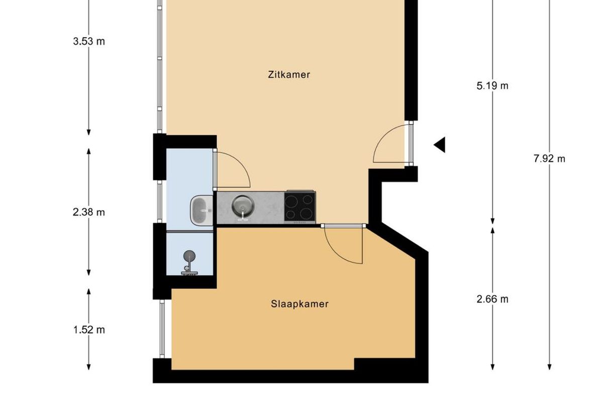 Entree op straatniveau, trap naar 1e etage. Zitkamer met schouw en open keuken met inbouwapparatuur. Badkamer met toilet, wastafel en douche, ruime slaapkamer.