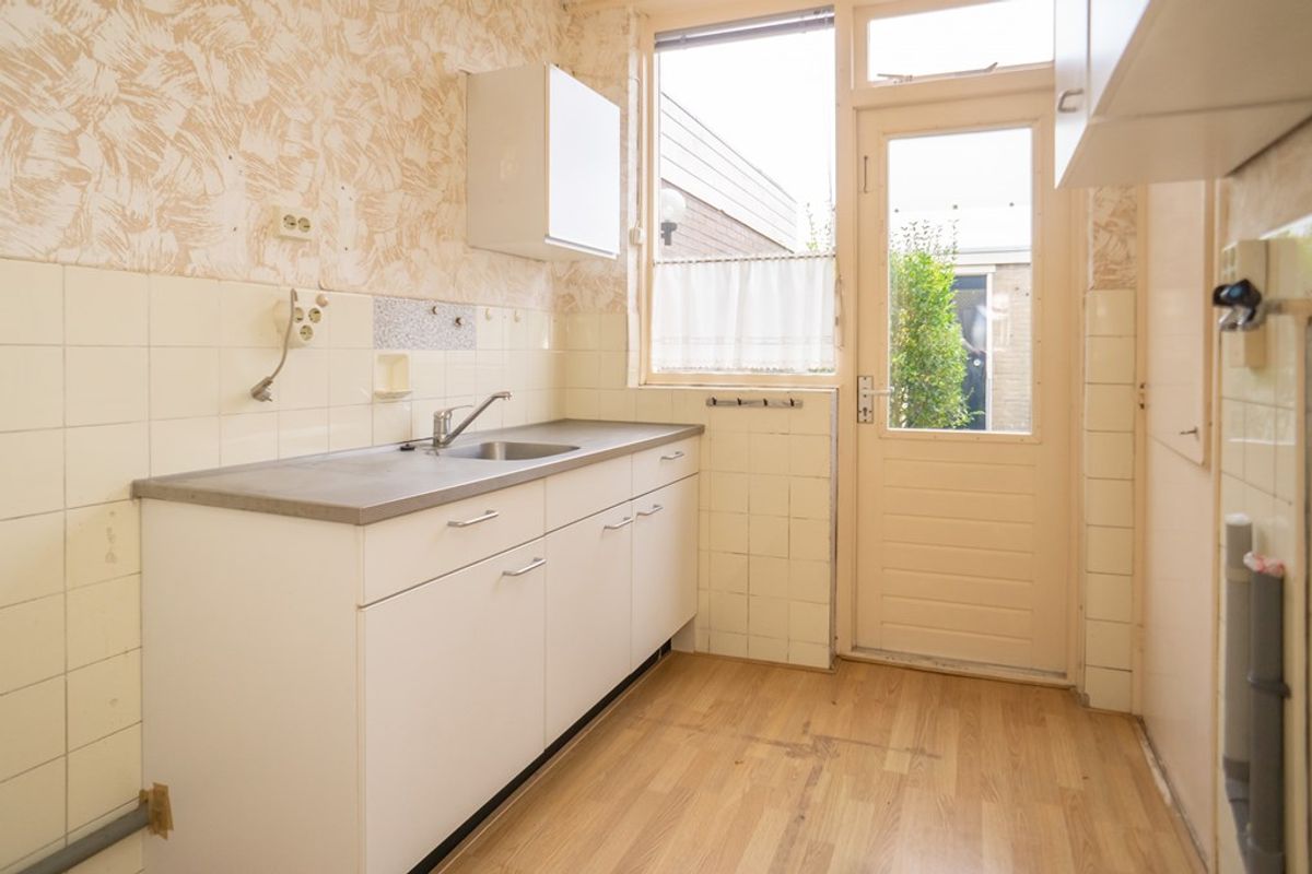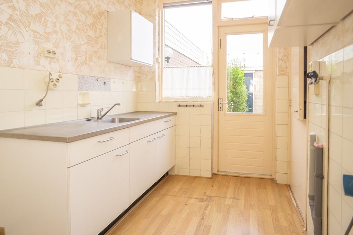De lichte doorzonwoonkamer op de begane grond is een fijne ruimte die u op verschillende manieren kunt indelen, afhankelijk van uw persoonlijke voorkeur. Of u nu kiest voor een tuingerichte of straatgerichte indeling, het is een ruimte die veel daglicht binnenlaat en een fijne sfeer biedt. De keuken, die eenvoudig is ingericht, biedt voldoende ruimte om naar eigen wens te verfrissen.