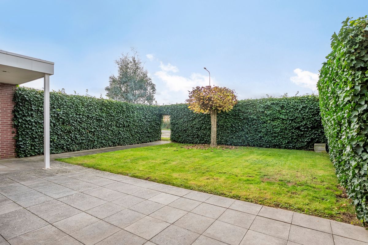 Het ruime terras beschikt deels over een sfeervolle overkapping vanuit de keuken en een uitval-zonnescherm bij de deur van de woonkamer naar het terras.