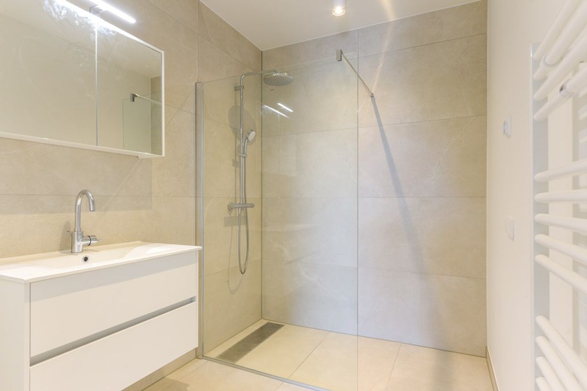 De badkamer is voorzien van een ruime inloopdouche en een wastafelmeubel met spiegel.