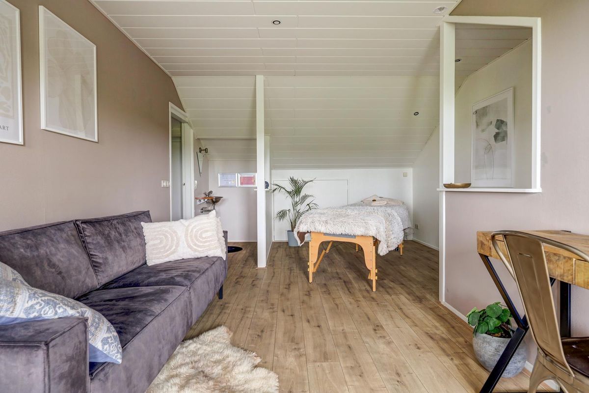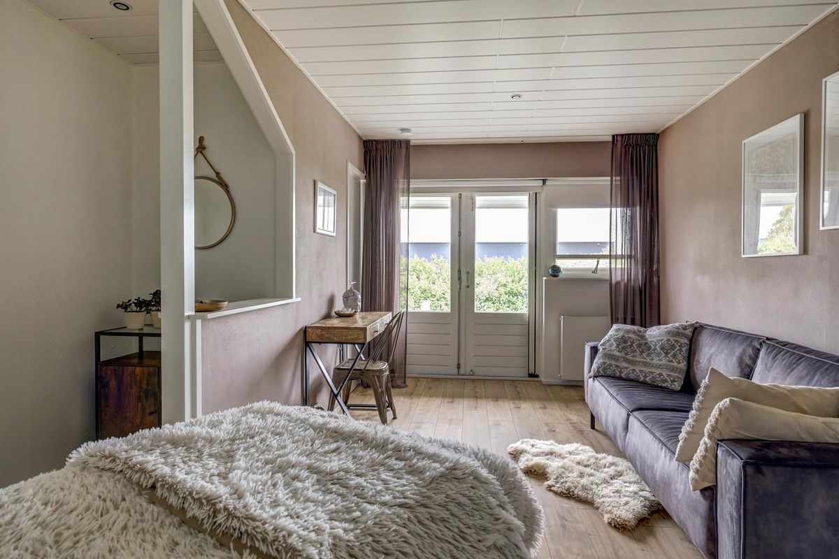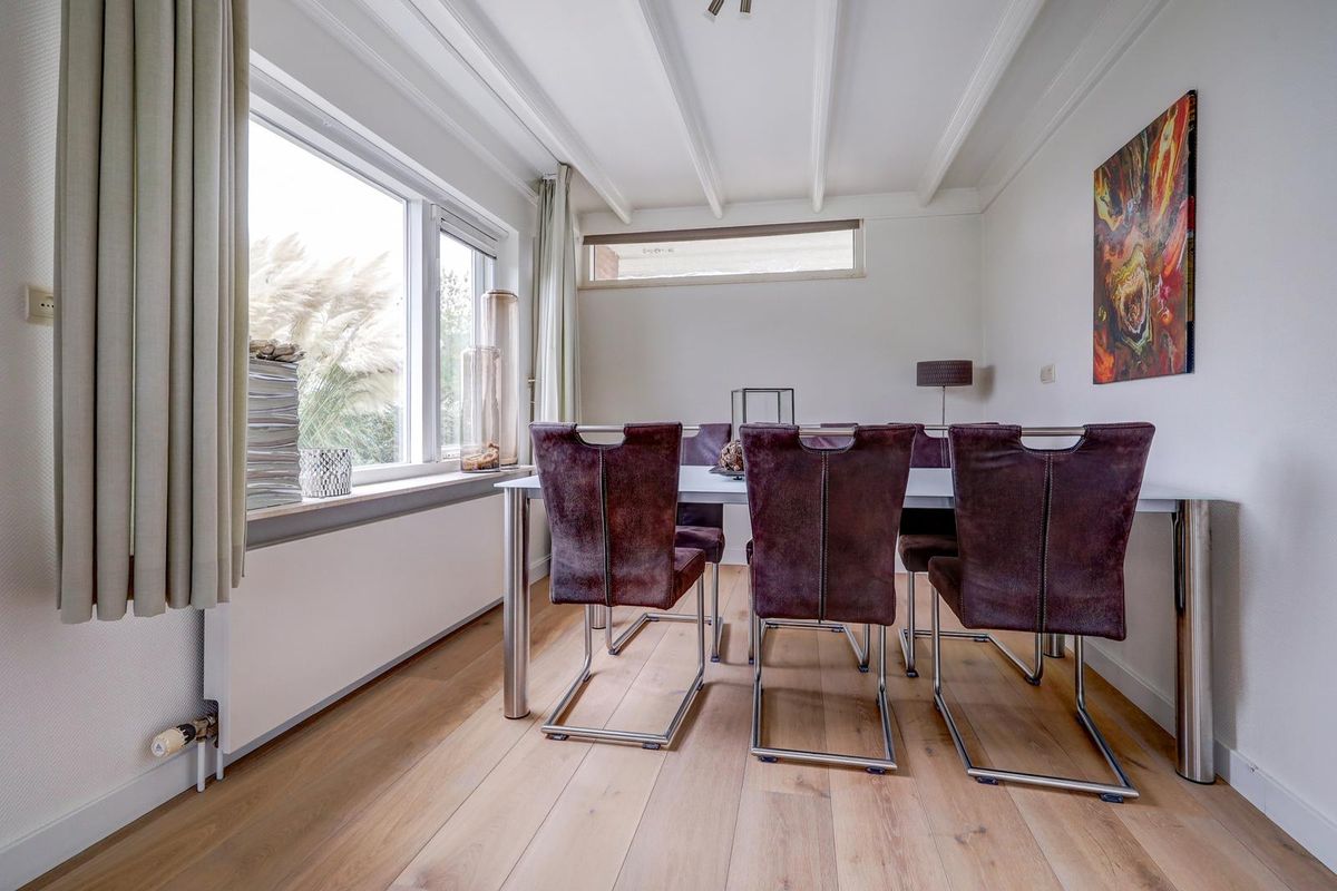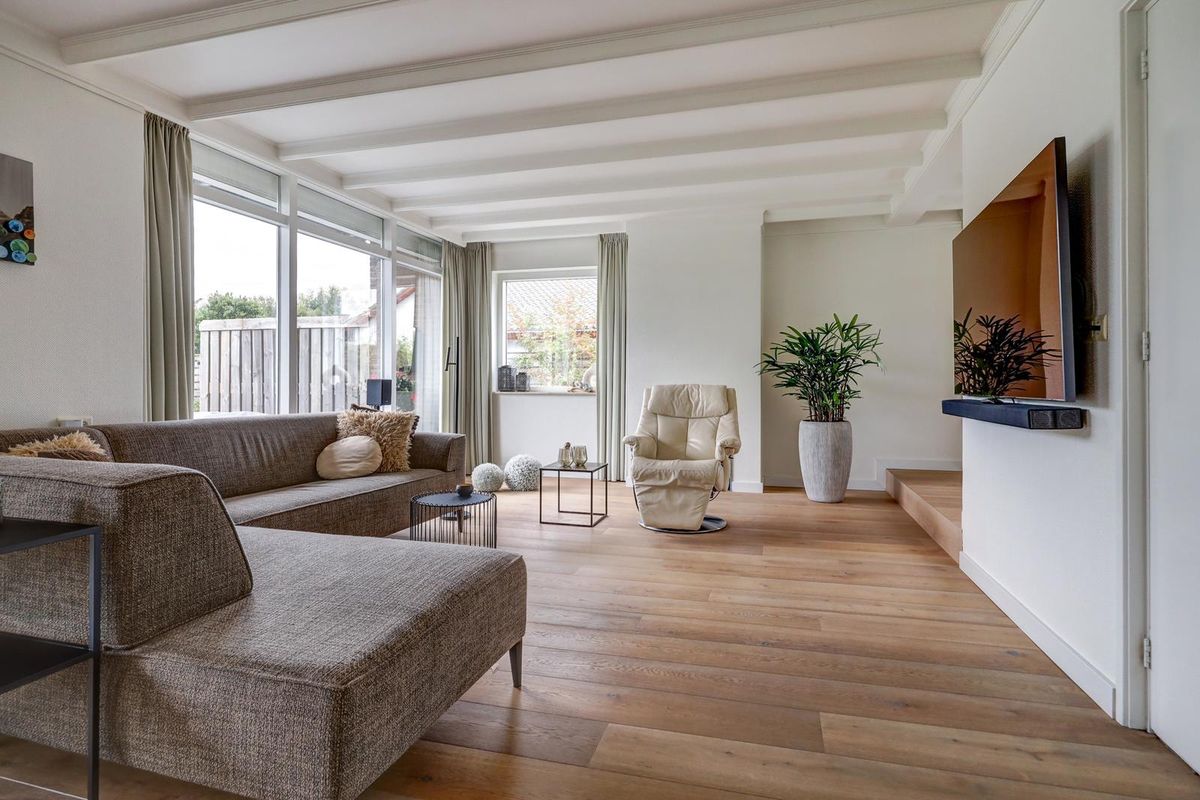 De woonkamer is royaal en sfeervol, met grote raampartijen die zorgen voor een zee van licht en een prachtig uitzicht op de tuin. De lichte wanden in combinatie met de houten vloer geven de ruimte een warme en moderne uitstraling. De zithoek aan de achterzijde is ruim opgezet, terwijl de achterzijde directe toegang biedt tot het terras. De woonruimte biedt bovendien ruimte voor een gezellige eettafel bij het raam, met uitzicht over de tuin.