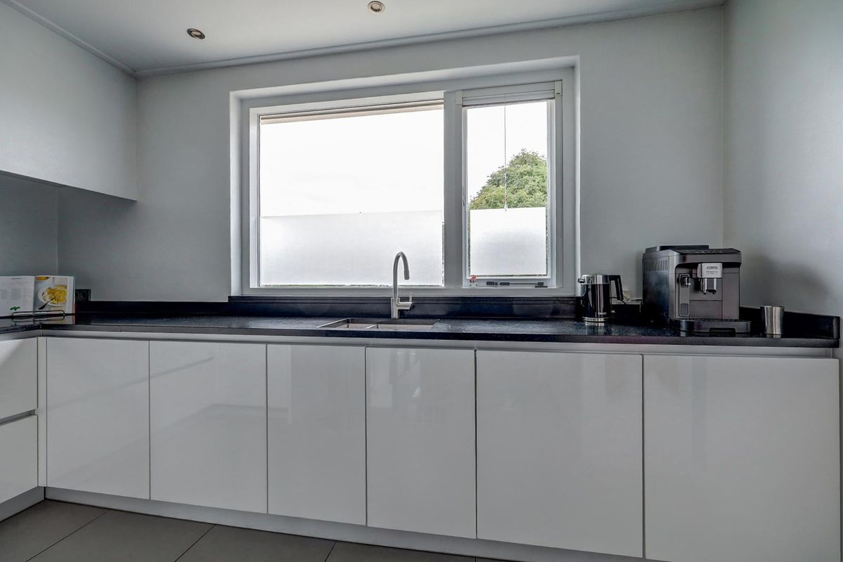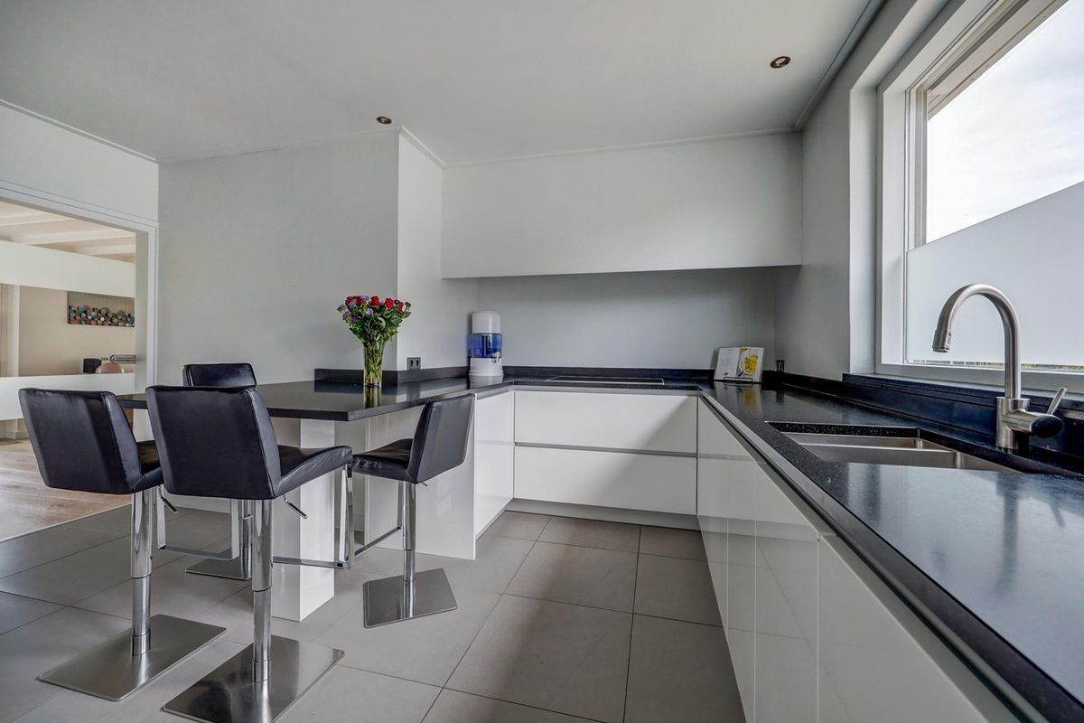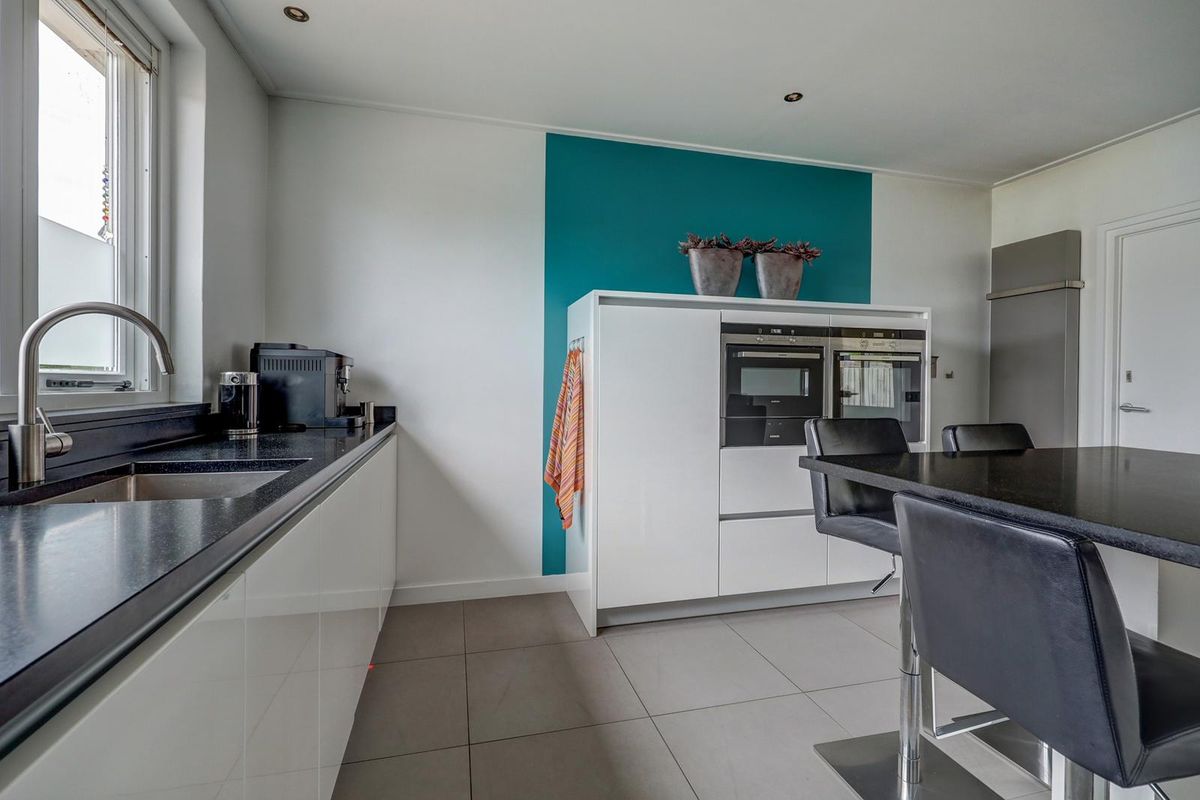 De moderne keuken bereikbaar vanuit de woonkamer ligt aan de voorzijde van de woning en is uitgevoerd in een strakke, witte opstelling met donker werkblad en een barzitje. Hier is het heerlijk koken dankzij de diverse inbouwapparatuur, waaronder een kookplaat, afzuigkap, oven, magnetron en koelkast.