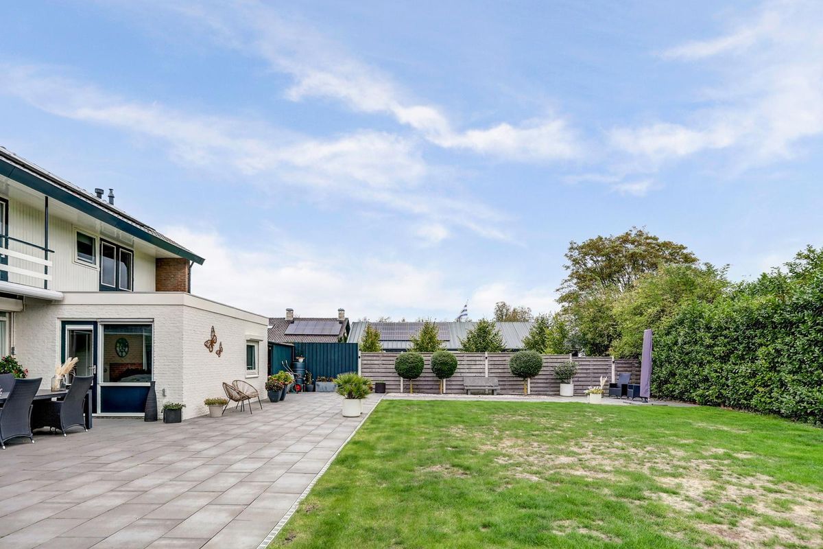 De achtertuin is royaal en fraai aangelegd met een groot terras, sierbestrating en een breed gazon. Dankzij de ligging en beplanting biedt de tuin veel privacy en een heerlijke plek om te ontspannen. Er is volop ruimte voor een zithoek, speeltoestellen of om te tuinieren. Aan de woning grenst een ruim terras met voldoende plek voor een grote eettafel. De oprit aan de voorzijde biedt plaats aan meerdere auto’s. De aangebouwde schuur biedt genoeg ruimte voor al uw tuingereedschap of fietsen.
