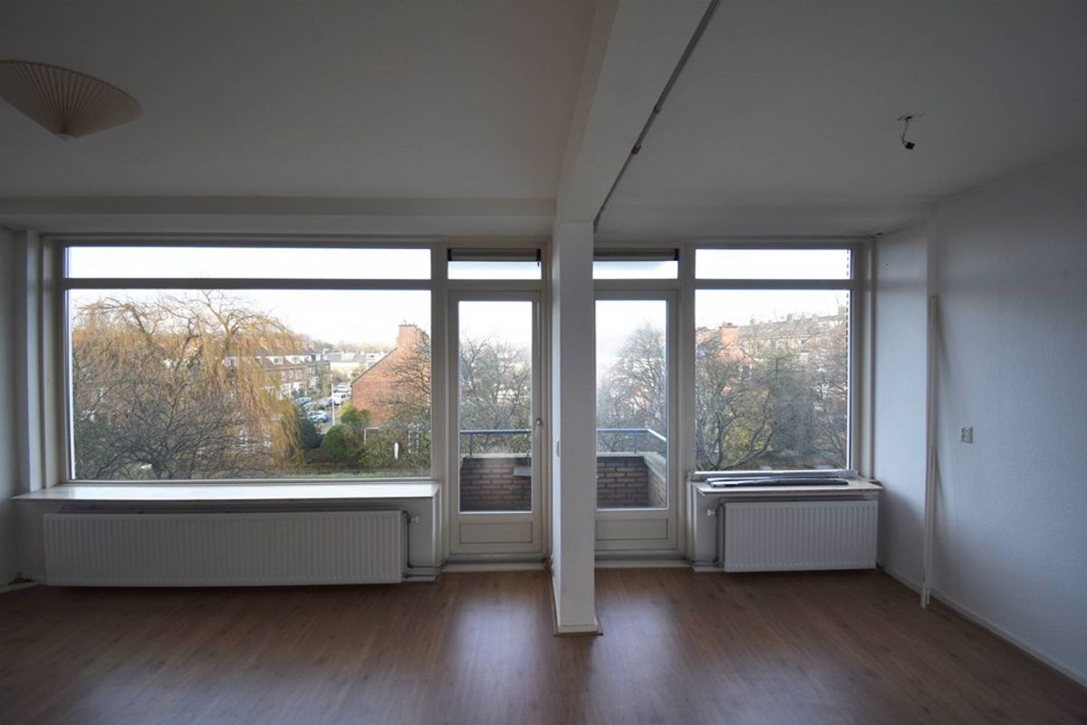 De lichte woonkamer geeft toegang tot het balkon aan de voorzijde.