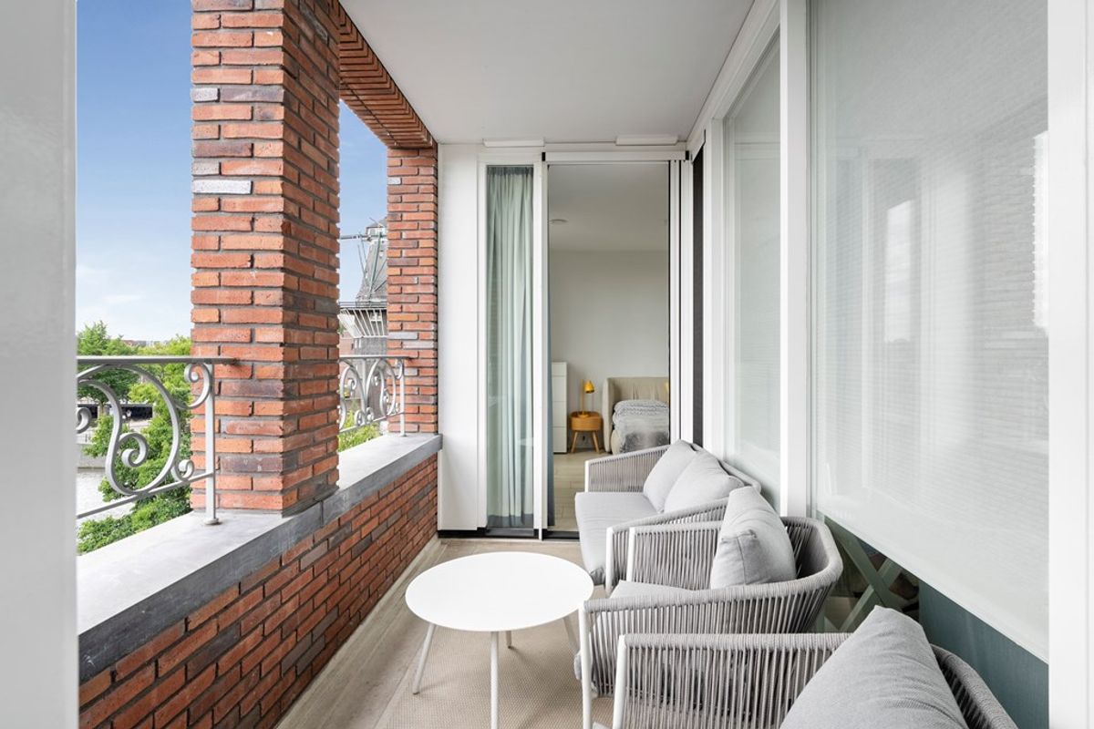 Vanuit de woonkamer stap je het balkon op, waar je een prachtig panorama hebt over het water, de Gooyer molen en de levendige omgeving van de Brouwerij ’t IJ.
