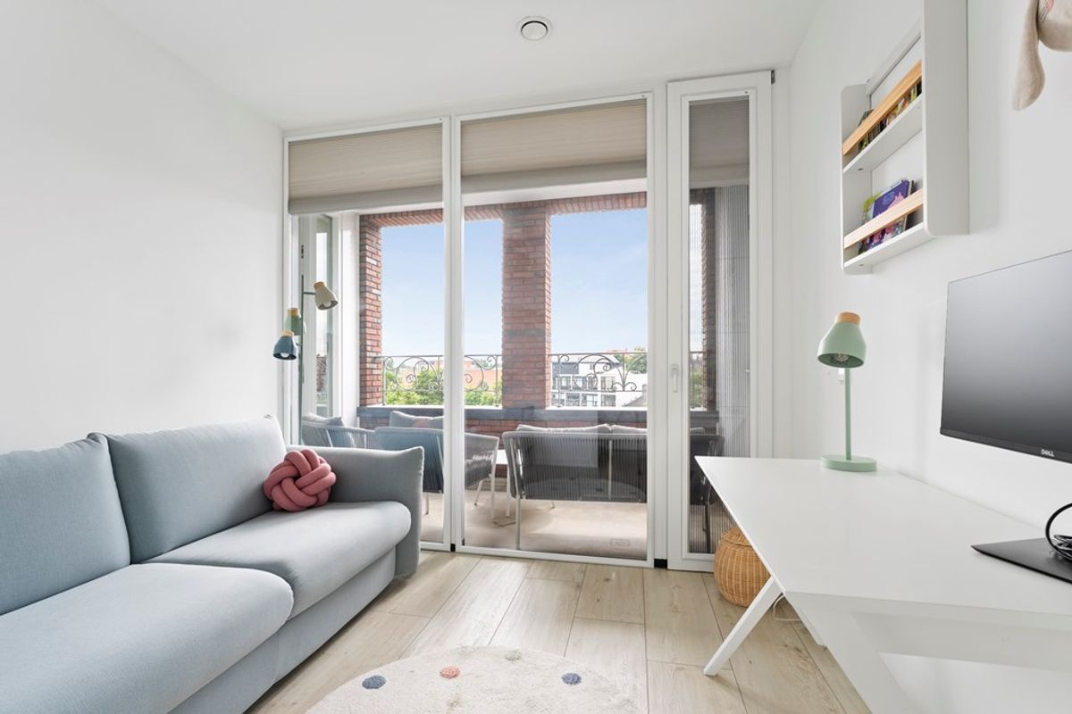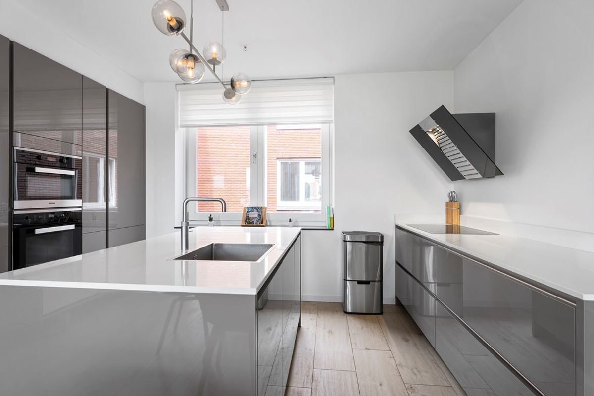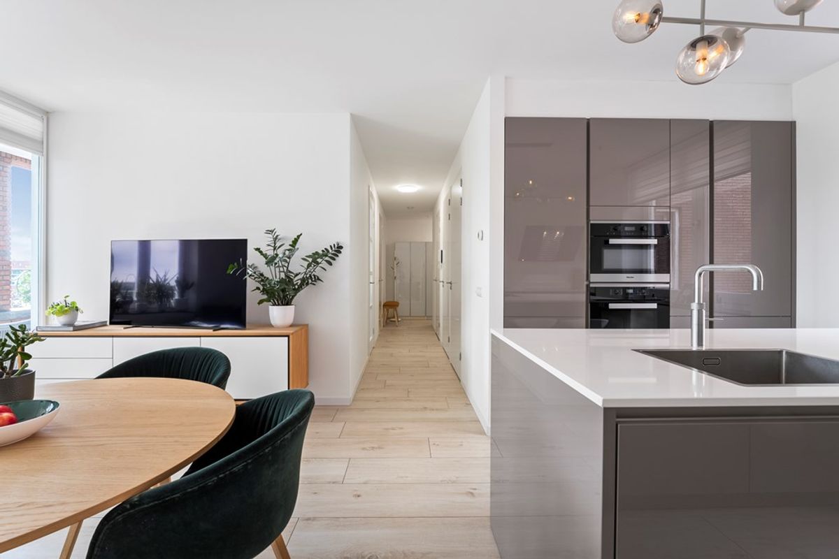 Vanuit de entree bereik je de lichte en ruime woonkamer met open keuken. Dankzij de ligging op het zuiden en de grote ramen geniet je hier de hele dag van zon en een schitterend uitzicht. De moderne keuken is van alle gemakken voorzien en vormt het hart van de woning – ideaal om gasten te ontvangen of uitgebreid te koken.