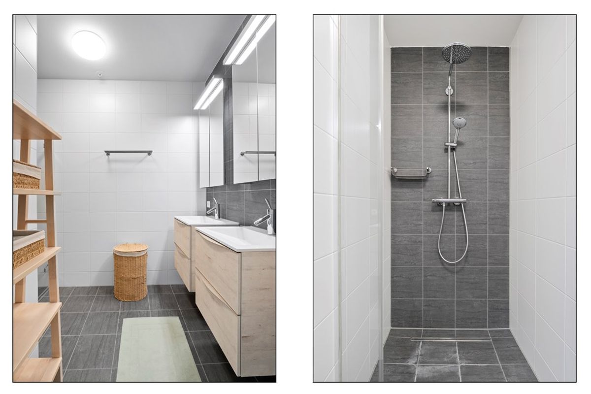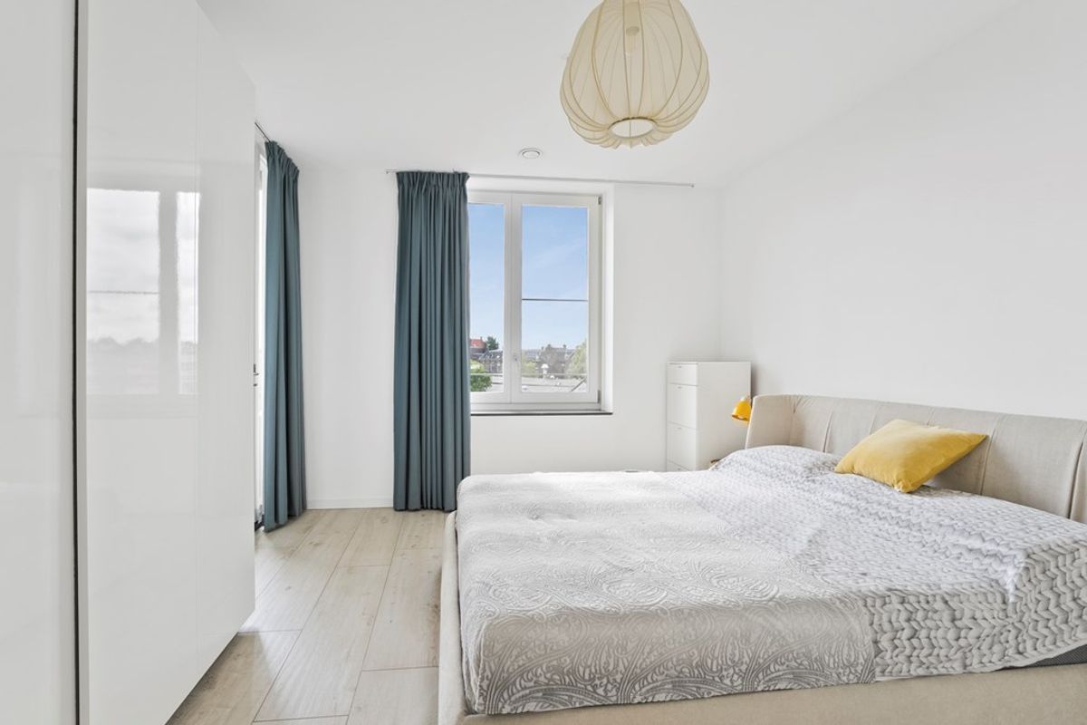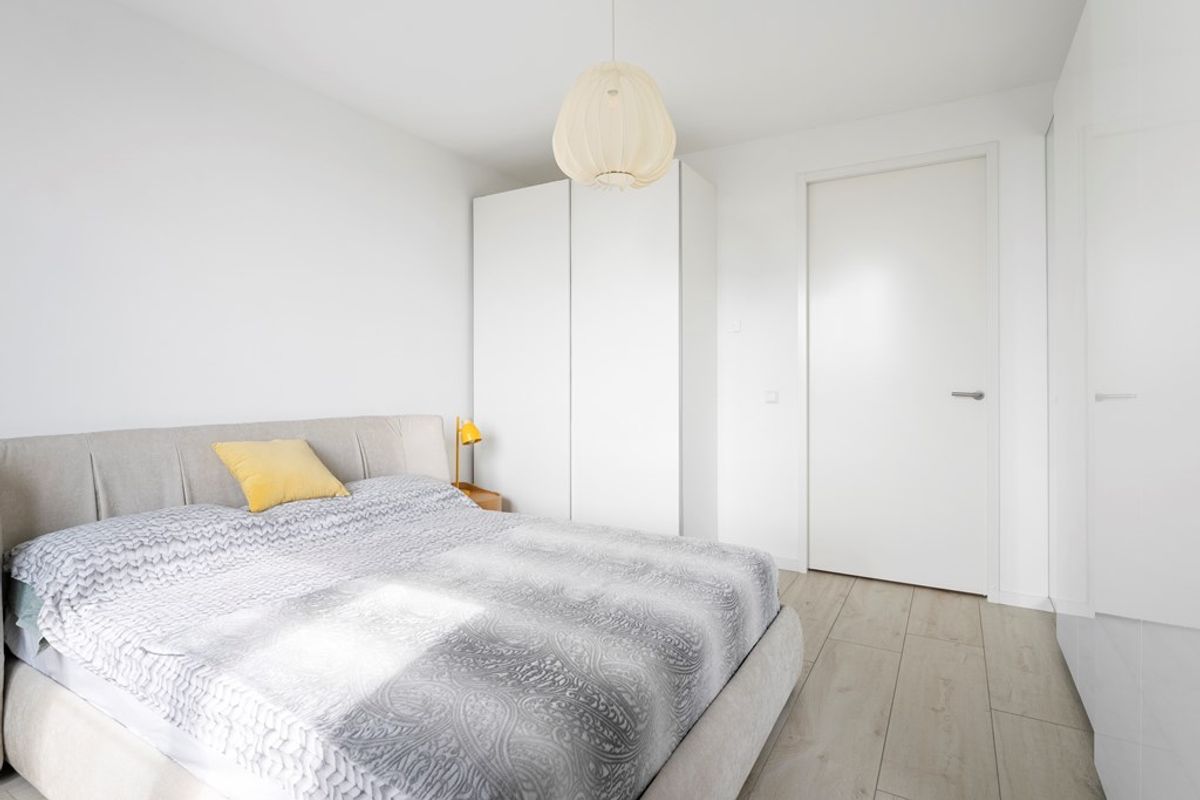 Het appartement beschikt over twee goed bemeten slaapkamers, een moderne badkamer met inloopdouche en dubbele wastafel, een separaat toilet en een praktische technische ruimte.