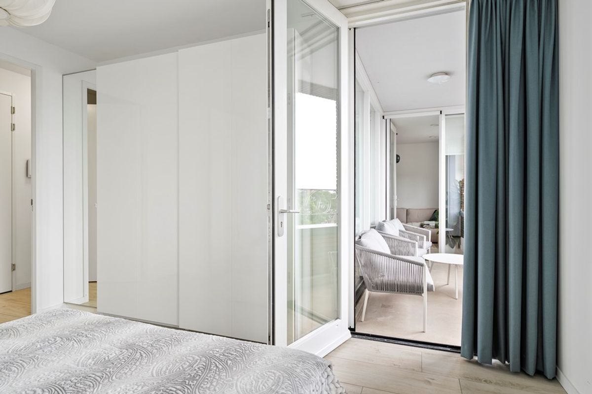 The entrance leads to a bright and spacious living room with open kitchen. Thanks to the south-facing position and large windows, the apartment is filled with natural light all day. The sleek, modern kitchen is fully equipped and perfect for cooking or entertaining.