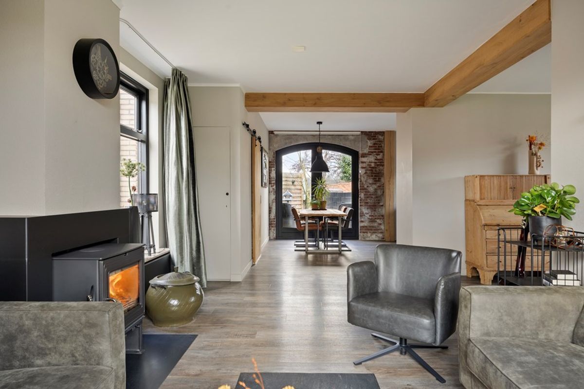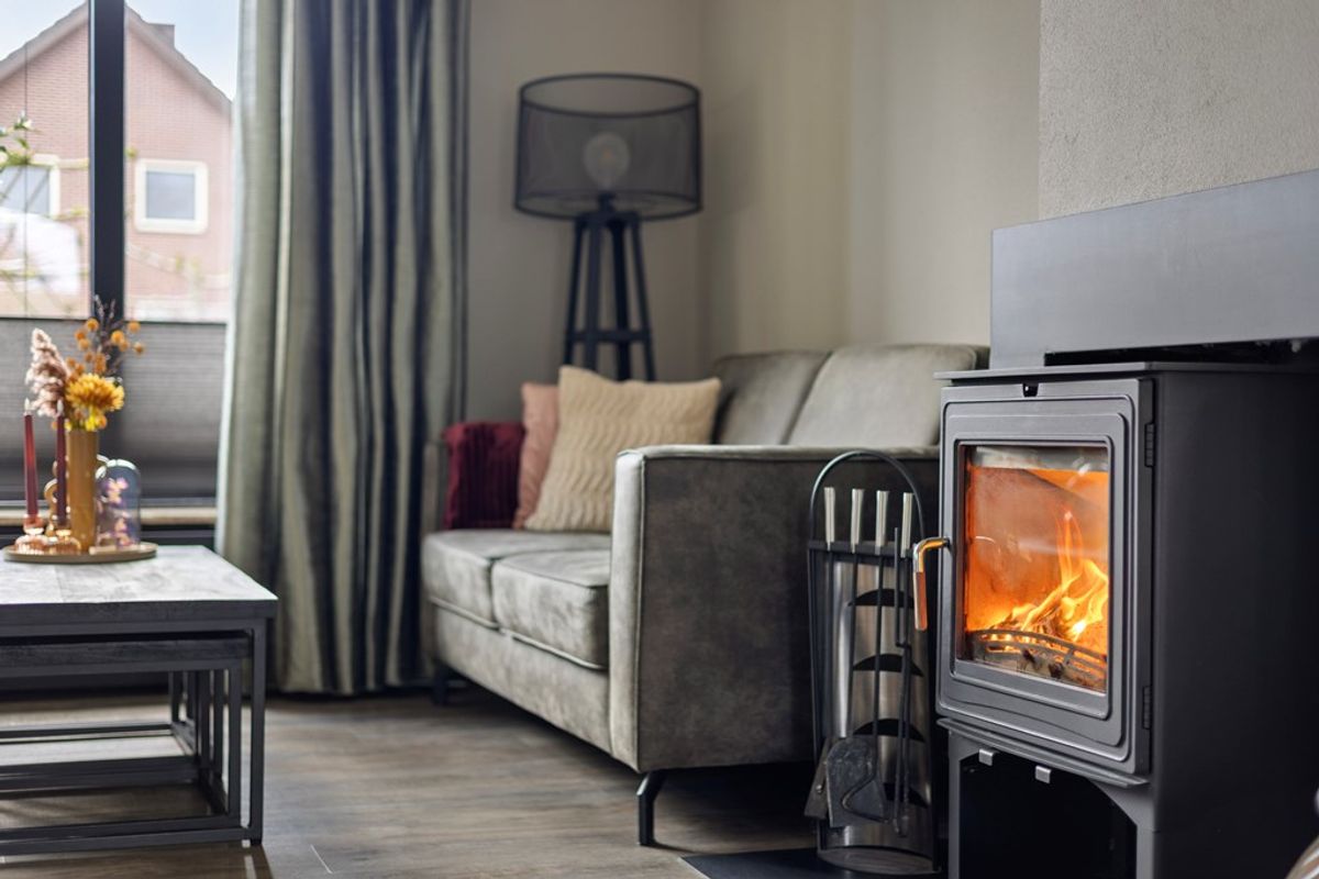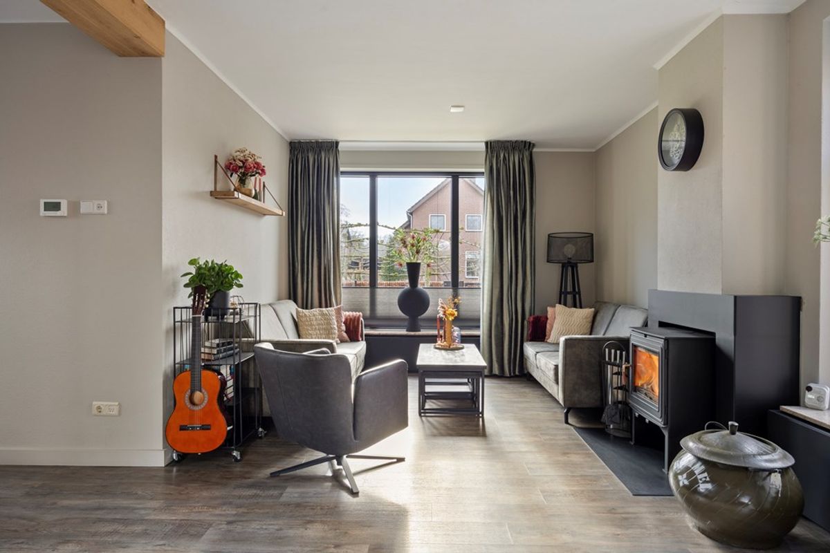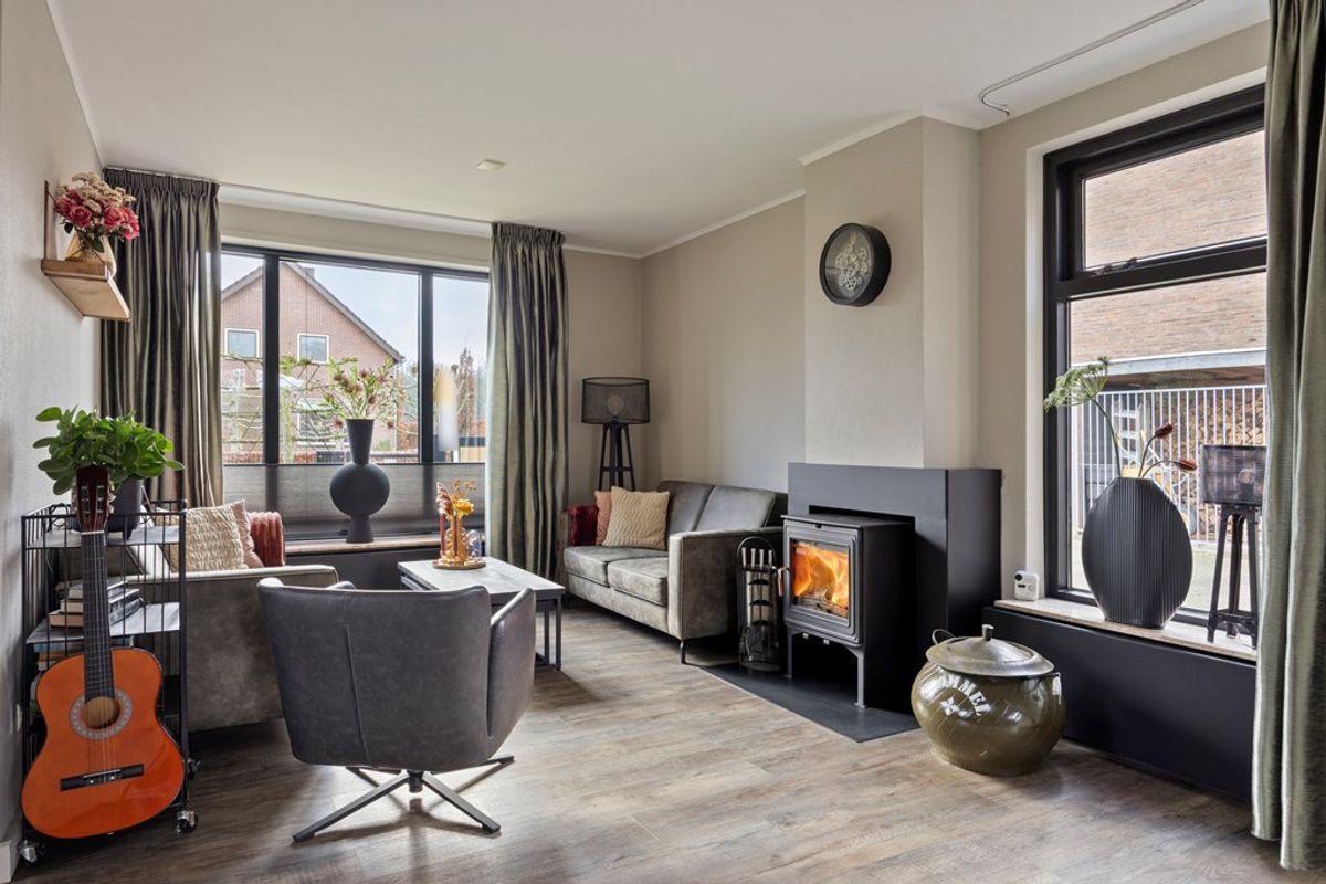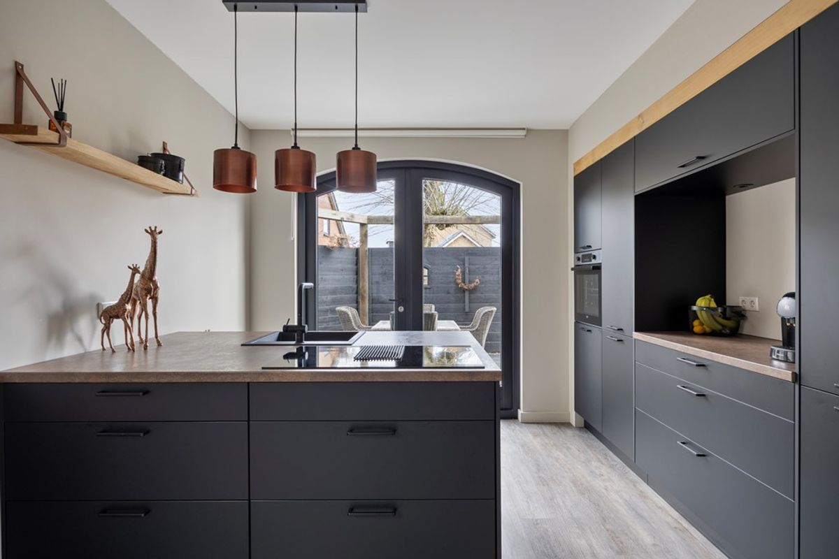 De woonkamer ligt aan de voorzijde en voelt direct warm en uitnodigend aan. Grote ramen zorgen voor een aangename lichtinval, terwijl de sfeervolle haard het natuurlijke middelpunt vormt van de zithoek. Hier ontstaat vanzelf een plek waar u ’s avonds neerstrijkt en waar bezoek zich direct thuis voelt. Richting de achterzijde gaat de ruimte vloeiend over in het eetgedeelte en de open keuken. Het kookeiland vormt een stoer en eigentijds accent, met volop werk- en kastruimte. De opstelling is compleet uitgevoerd met een inductiekookplaat met geïntegreerde afzuiging, combi-oven, vaatwasser en koelkast. Openslaande deuren verbinden het interieur met het terras, waardoor binnen en buiten op een natuurlijke manier samenkomen.