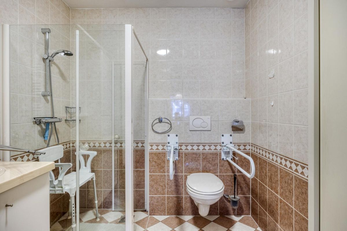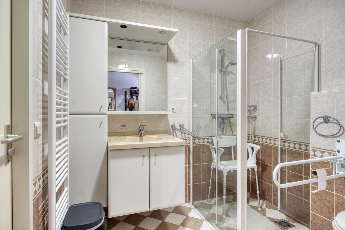De badkamer is afgewerkt met een tegelvloer, tegelwerk als wandafwerking en schuurwerk als plafondafwerking en is voorzien van een inloopdouche, badkamermeubel met wastafel, een hangend closet, een designradiator en mechanische ventilatie.