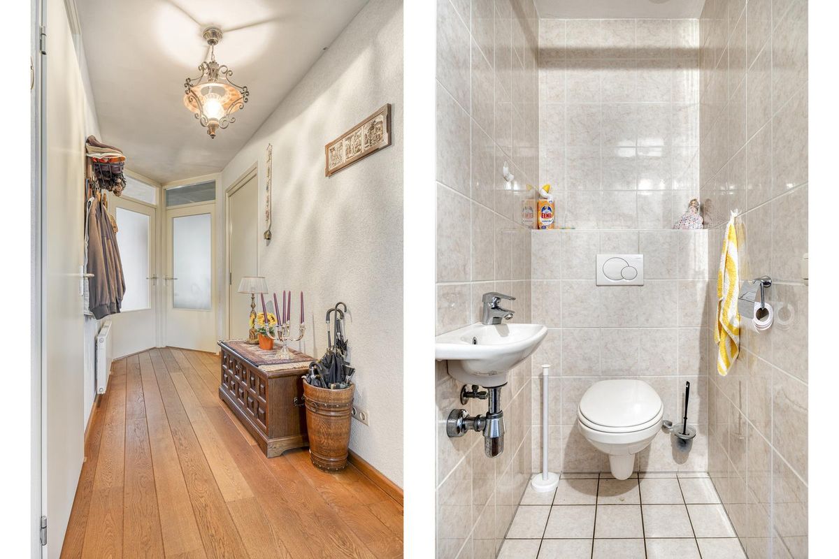 Het geheel betegelde toilet afgewerkt met een schuurwerk plafond is voorzien van een hangend closet en een fonteintje.