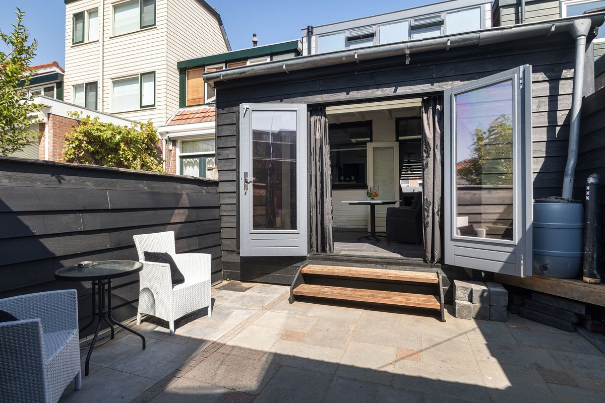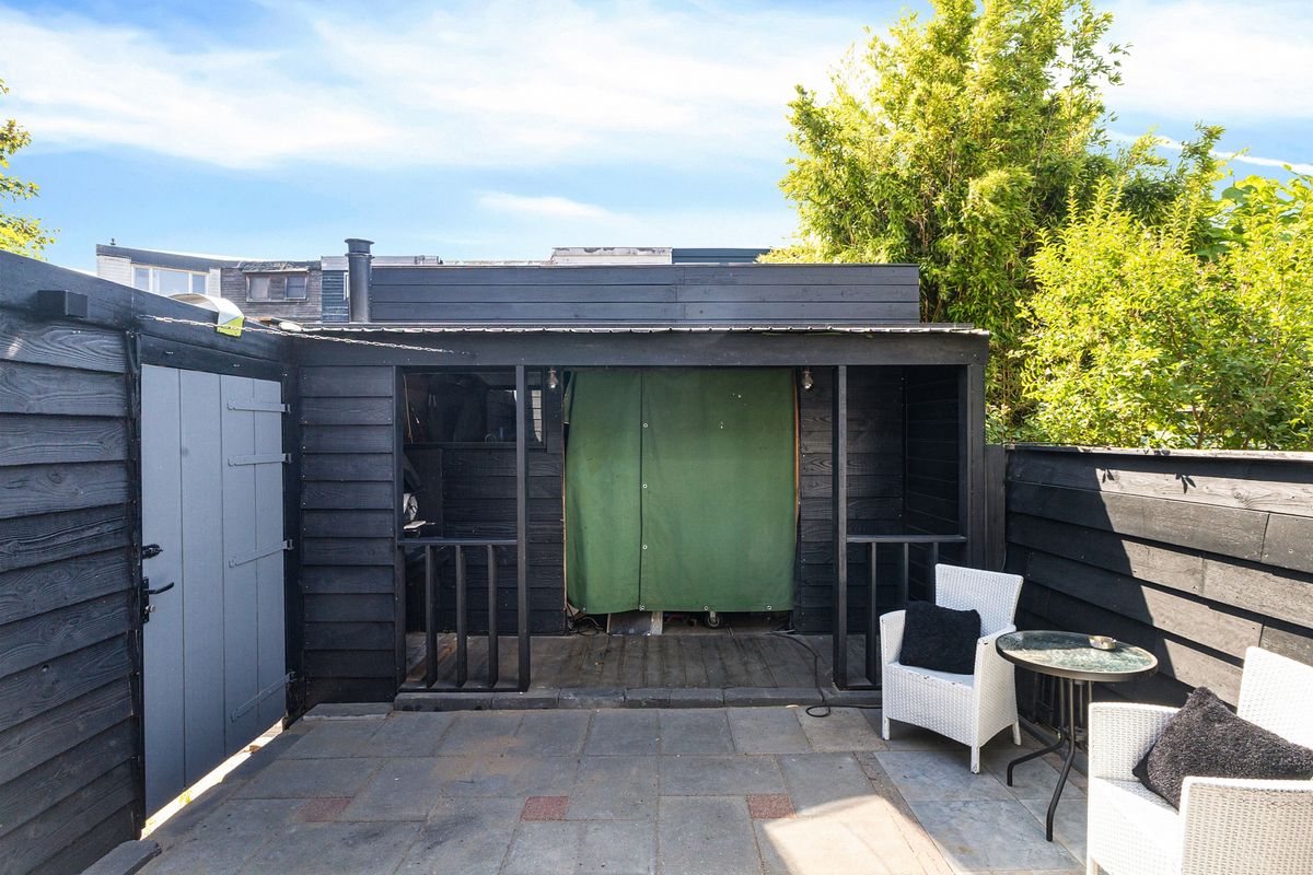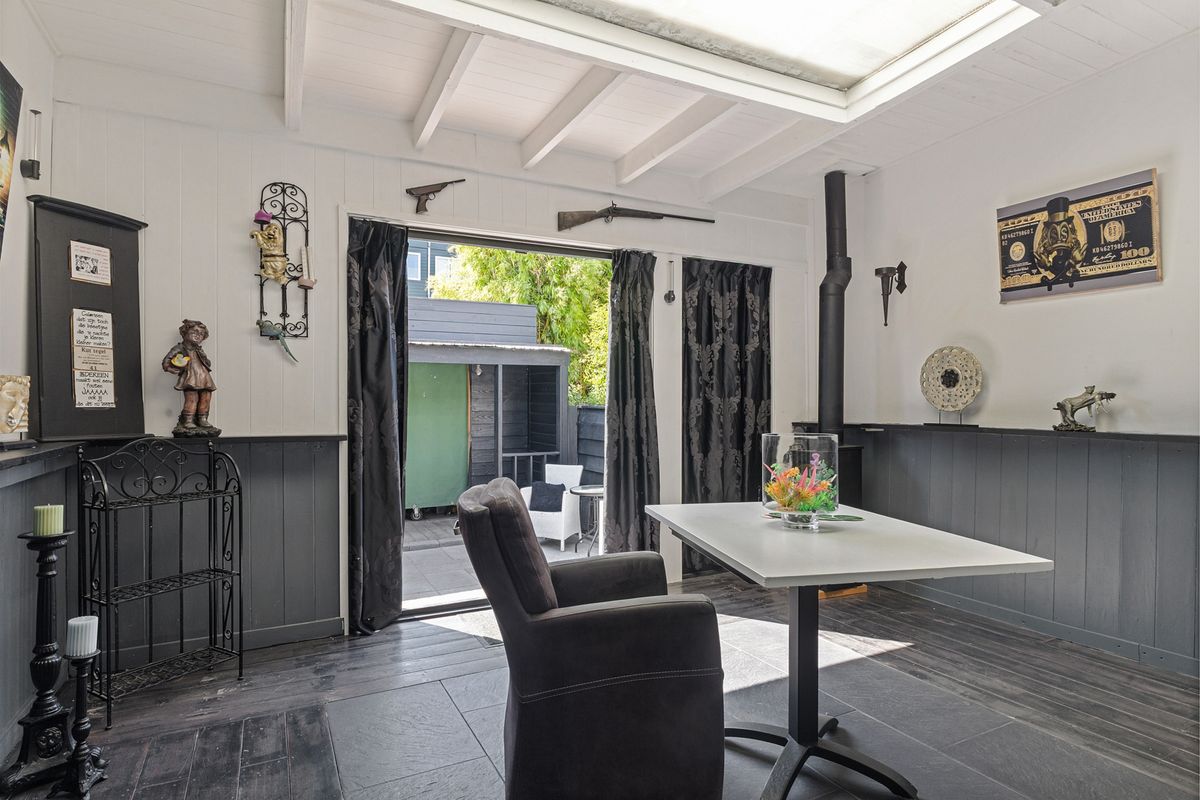 De woonkamer is uitgebreid met een uitbouw met dakraam, waardoor er veel licht naar binnen valt. Er is door de uitbouw genoeg ruimte voor een knusse zithoek, maar ook om een gezellige eethoek te creëren. De openslaande deuren naar de tuin zorgen ervoor dat je buiten naar binnen kan halen. De tuin is nog verassend ruim en heeft een berging om fietsen te stallen of spullen op te bergen die je niet dagelijks gebruikt.