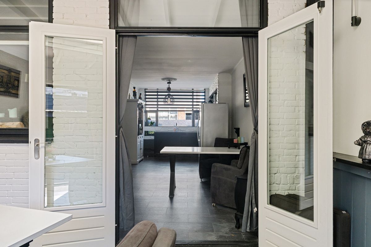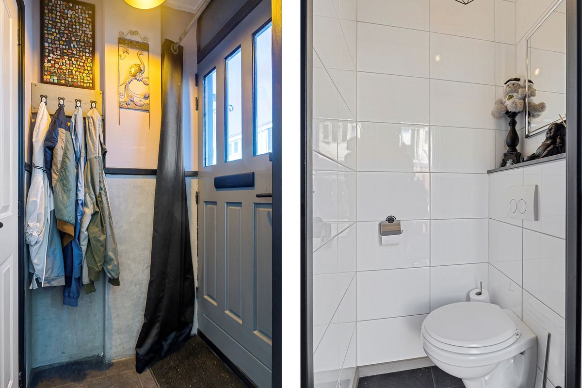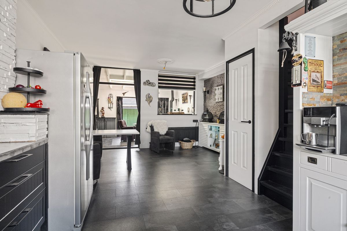 You enter the hall, which gives access to the toilet and the door to the open kitchen. The kitchen is equipped with a gas hob, oven, dishwasher, American fridge-freezer, and plenty of countertop space for preparing delicious meals. Under the stairs, you will find the meter cupboard, which also provides extra storage space for supplies. The living room has been extended with an addition featuring a skylight, allowing natural light to flood in. The extension offers enough room for a cozy seating area as well as a dining space. French doors open onto the garden, seamlessly blending indoors and outdoors. The garden is surprisingly spacious and includes a storage shed for bikes or items you do not use every day.