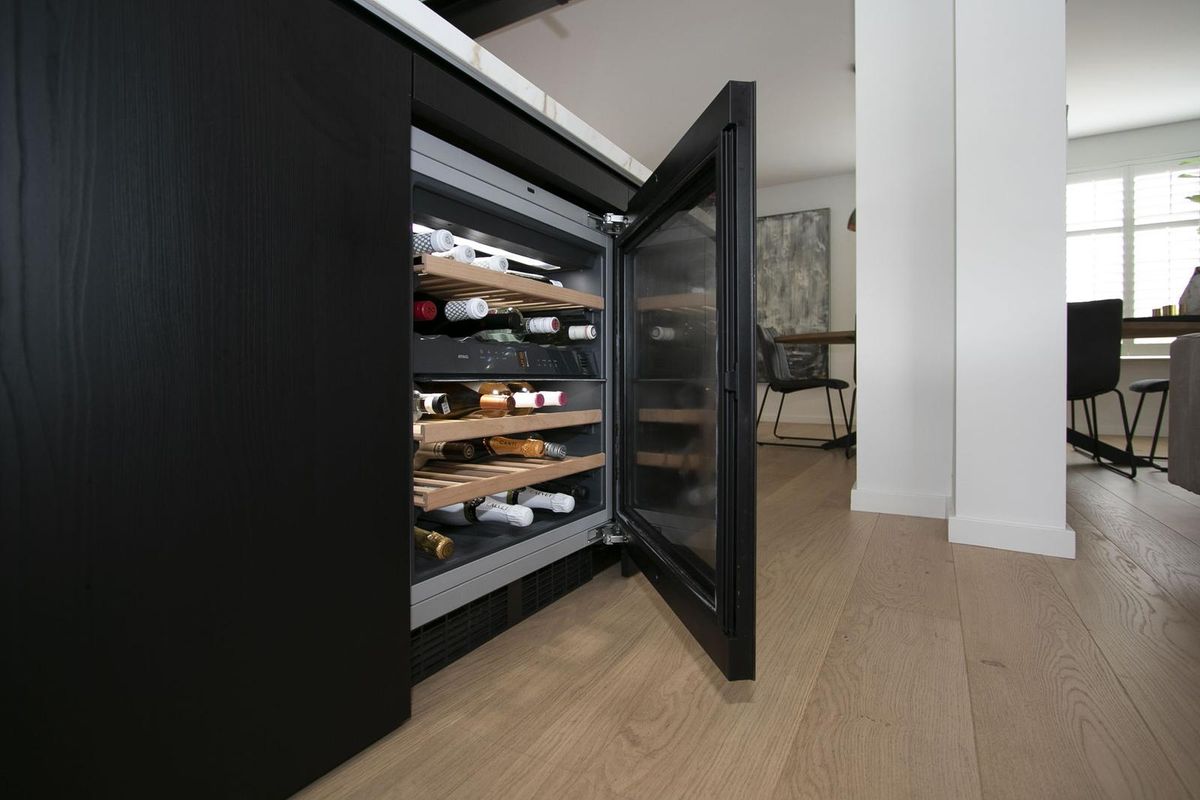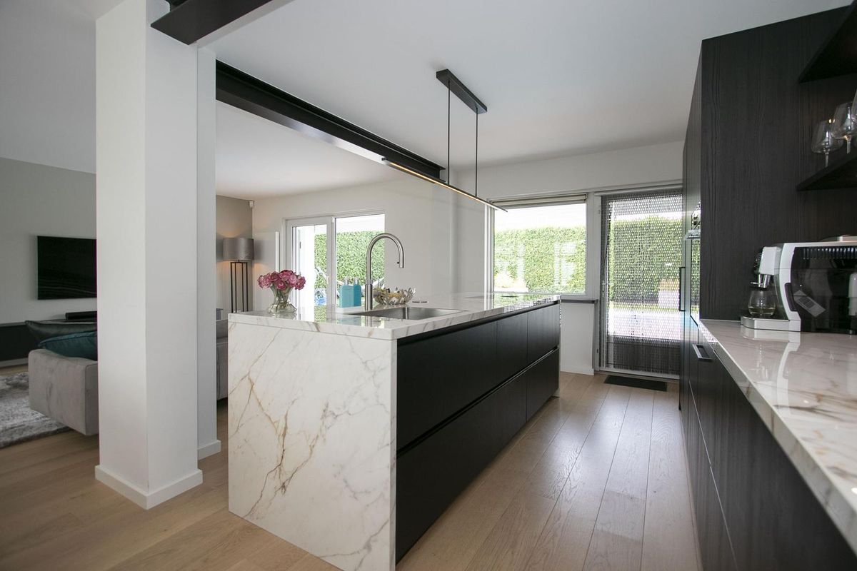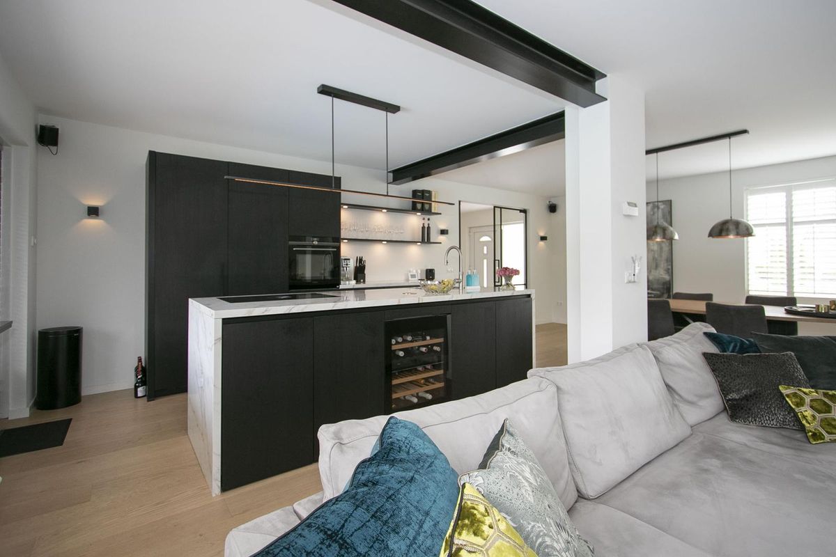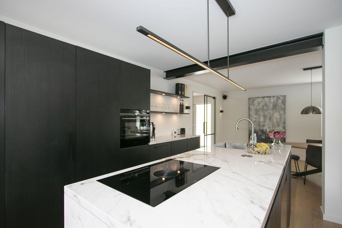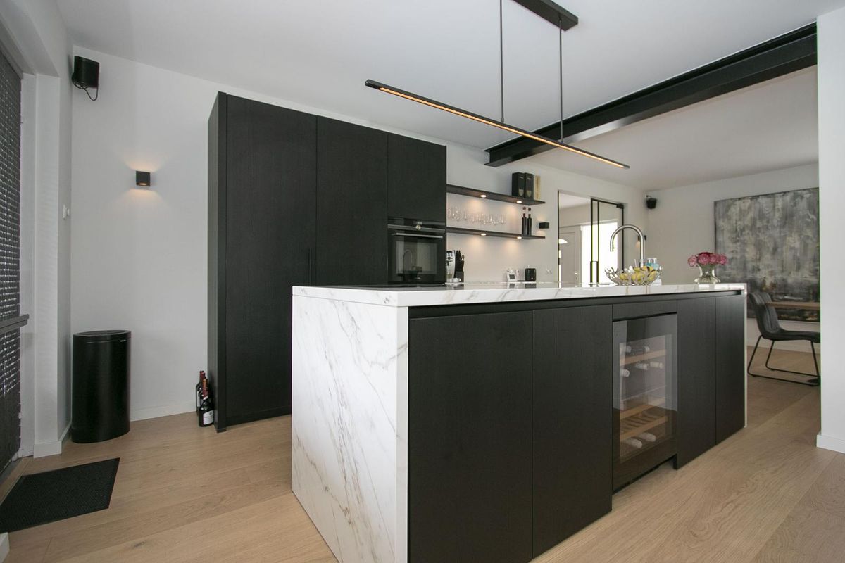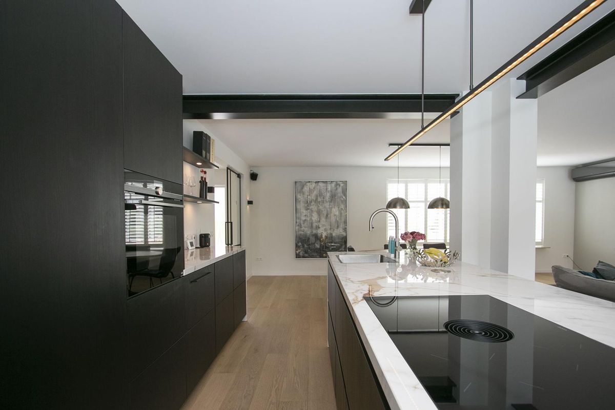 Aan de linkerzijde is via stoere stalen deurpartij de megamooie open ruimte met design keuken en woonkamer gelegen. Deze grote ruimte is ruim van opzet en is uitgerust met een keukenopstand tegen de wand en een vrijstaand kookeiland. De mooie marmeren omlijsting zorgt voor een exclusieve uitstraling. Deze keuken is v.v. alle gebruikelijke comfort waaronder een inductiekookplaat, ingebouwde Bora afzuiging, koel-vriescombinatie, vaatwasser, combi-oven, quoocker en wijntemperatuur kast.
