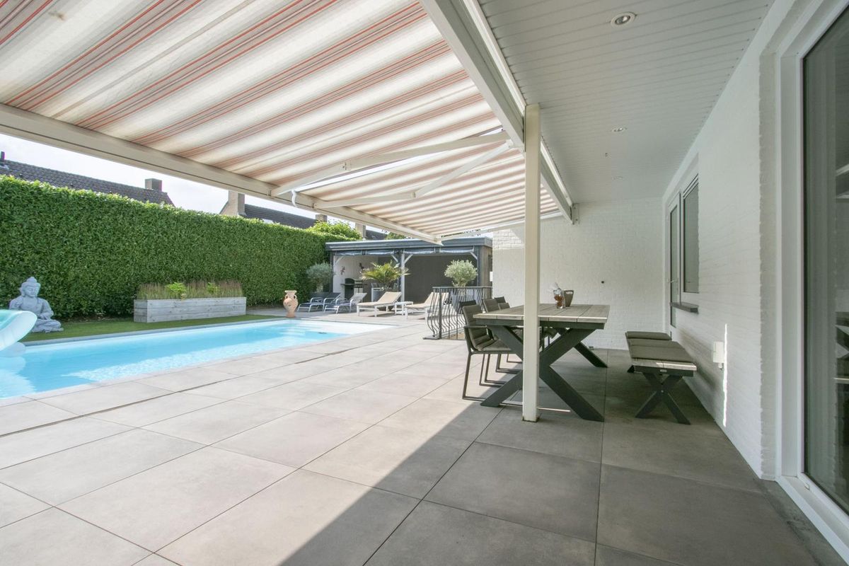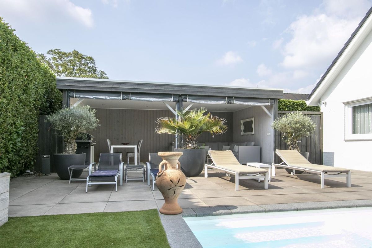 De overkapte lounge-hoek aan het begin van dit mooie zwembad zorgt voor een weldadig zicht over tuin en zwembad en de heerlijke buitendouche.