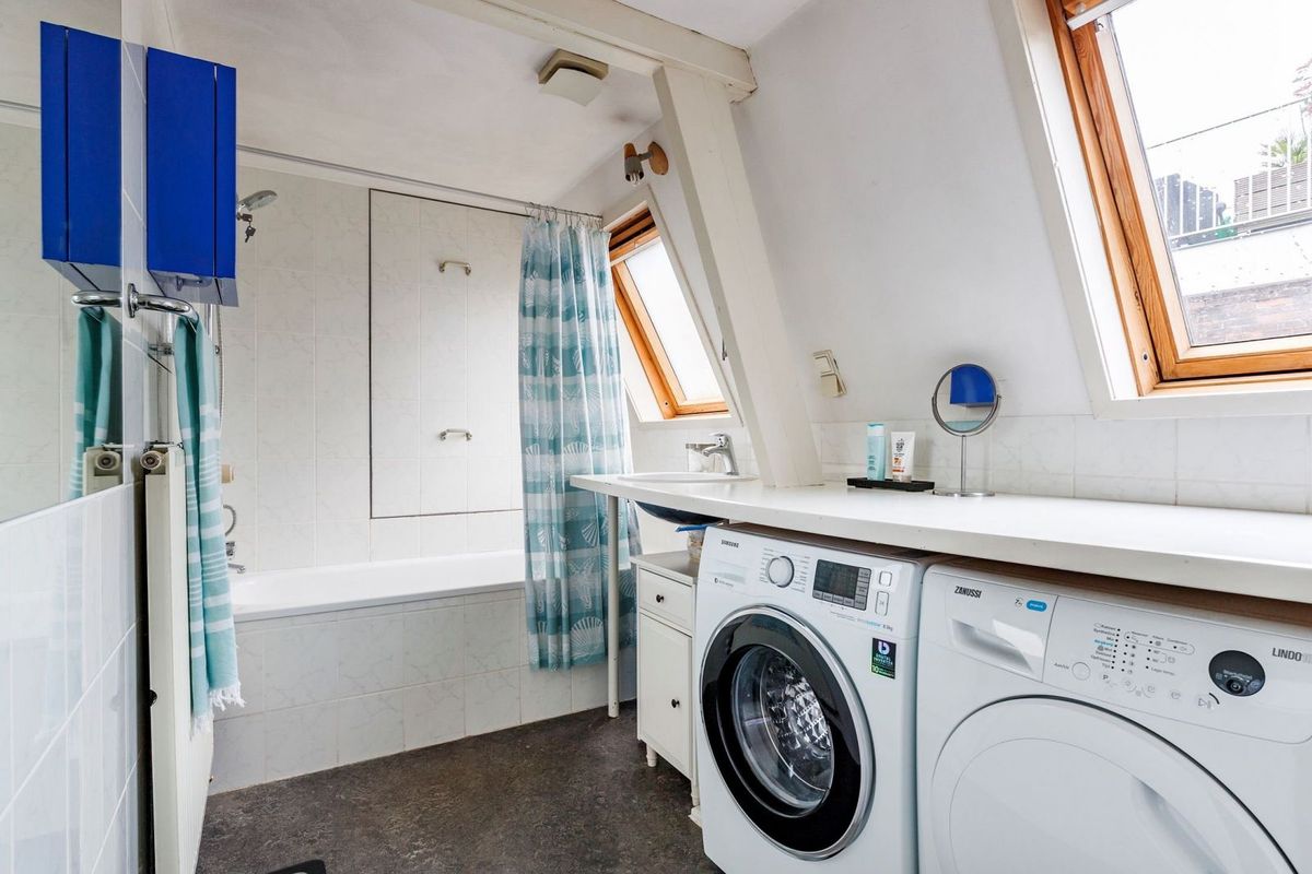 Spacious bedroom with skylight and dormer window. Bathroom with bath, washbasin, second toilet, washing machine and dryer.