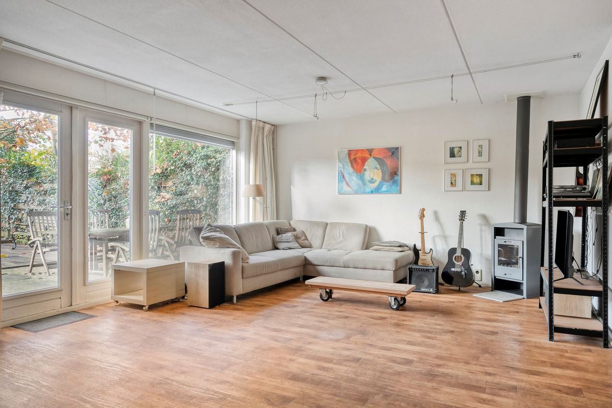 Wanneer u de woning binnenkomt, komt u in de hal en treft u rechts de garderoberuimte aan, ook bevindt zich hier het toilet en de trapopgang met daaronder een trapkast. Dan betreedt u de zeer ruime woonkamer. Dankzij de vele ramen valt er veel daglicht binnen en de aanwezige houtkachel (ter overname) zorgt voor een warme, gezellige sfeer. De begane grond is bovendien voorzien van vloerverwarming, wat bijdraagt aan het wooncomfort.