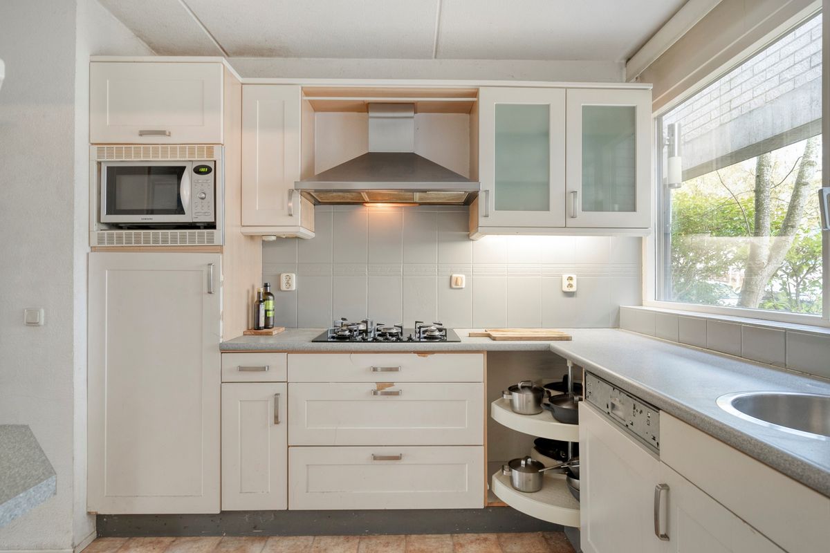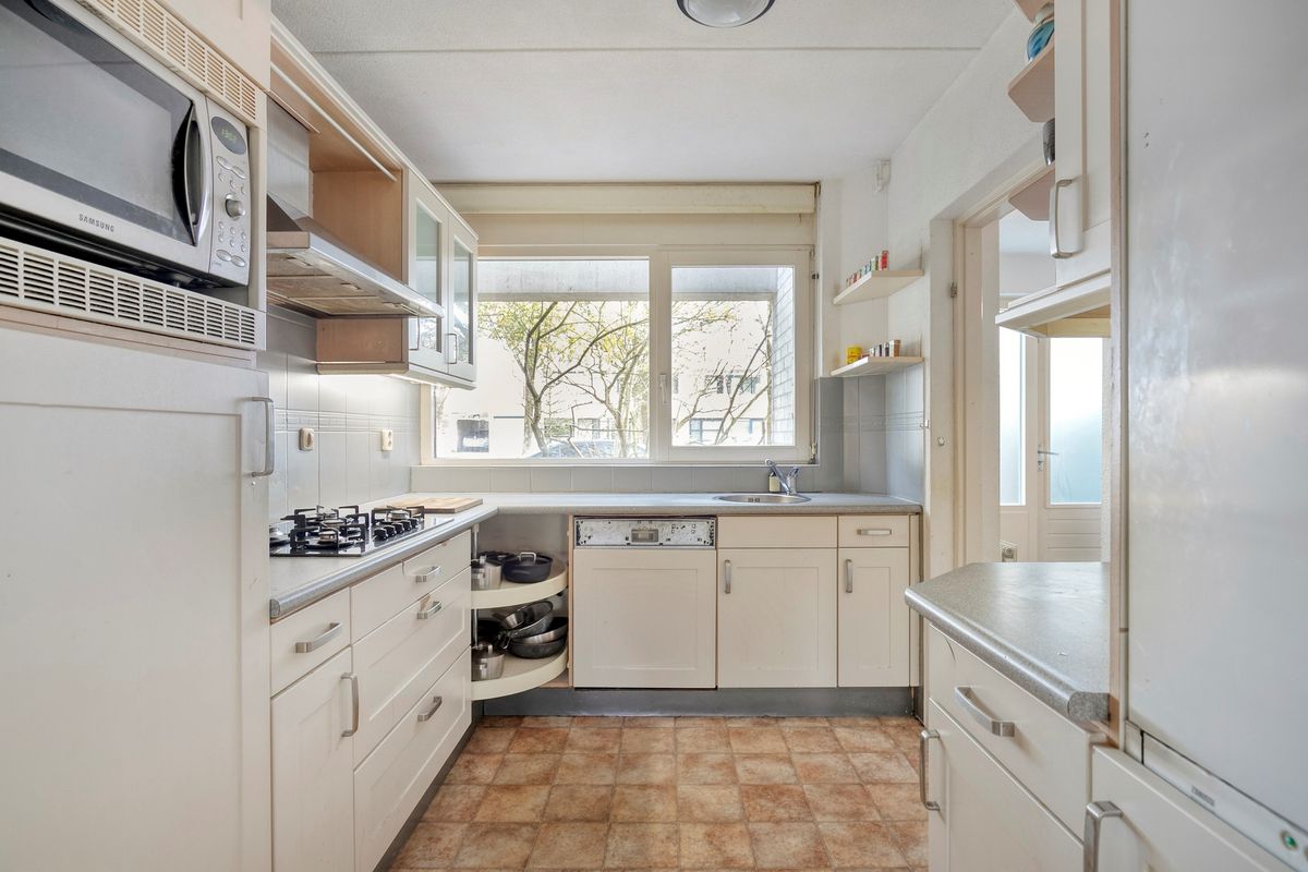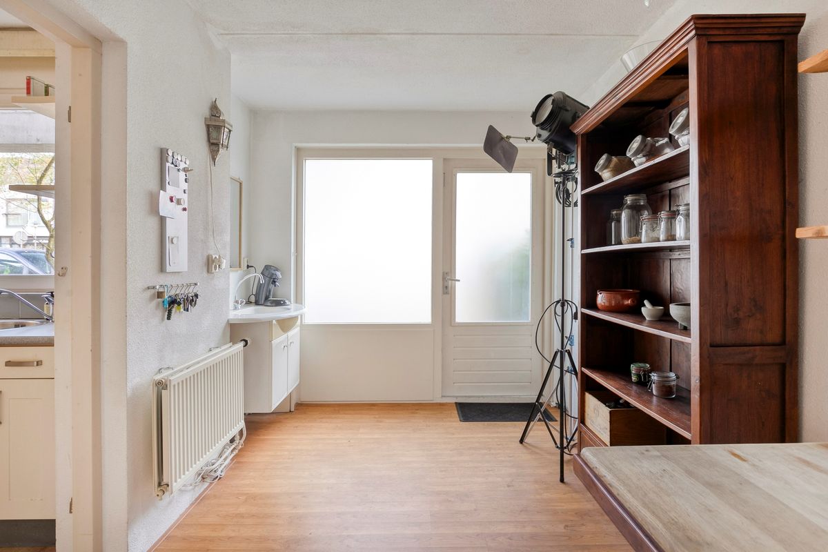 De open keuken is gedateerd en is aan vervanging toe, uiteraard is deze nog wel functioneel, u vind er een vaatwasser, combimagnetron, koelkast, en een gaskookplaat met afzuigkap. Dan komt u in de voormalige garage welke is verbouwd tot twee afzonderlijke werk-/studeerruimtes. Eén van deze ruimtes beschikt zelfs over een aparte entree, waardoor deze uitermate geschikt is voor een praktijk aan huis, kantoorruimte of atelier. Ook biedt dit uitstekende mogelijkheden om de woning levensloopbestendig te maken door hier een slaapkamer met badkamer te realiseren.