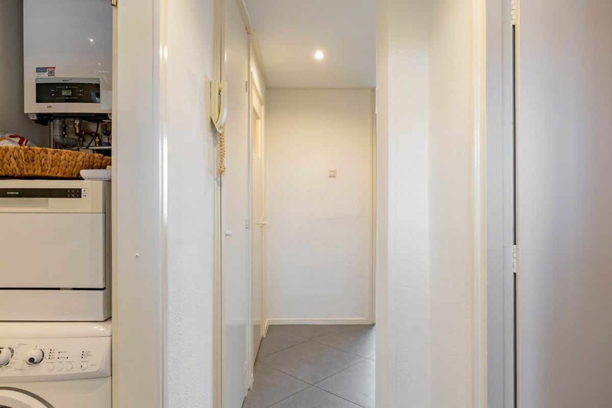 The hallway leads to the modern kitchen, fully equipped with built-in appliances. Adjacent is the fresh bathroom with a walk-in shower. On the other side of the hallway is the spacious bedroom with a double sink. You'll also find a separate toilet and the spacious, bright living room. From the living room, you can step onto the sunny balcony, where you can enjoy stunning views of the city, including the Martini Tower.