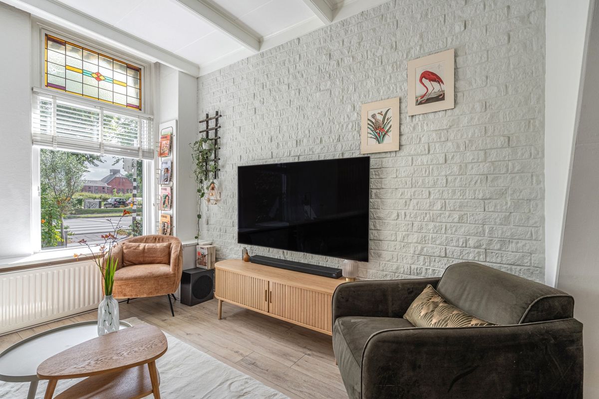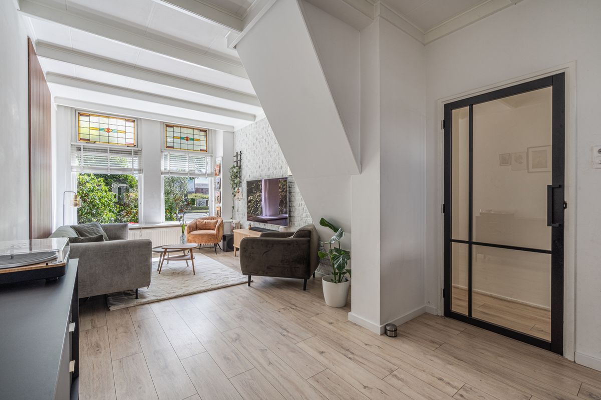 Royale woonkamer (ca. 29m2) met hoog balkenplafond en karakteristieke glas-in-loodramen;