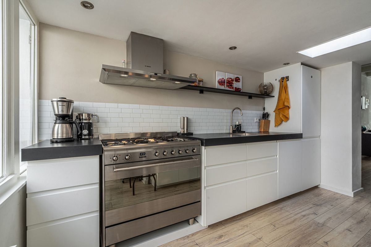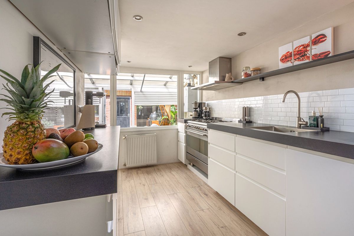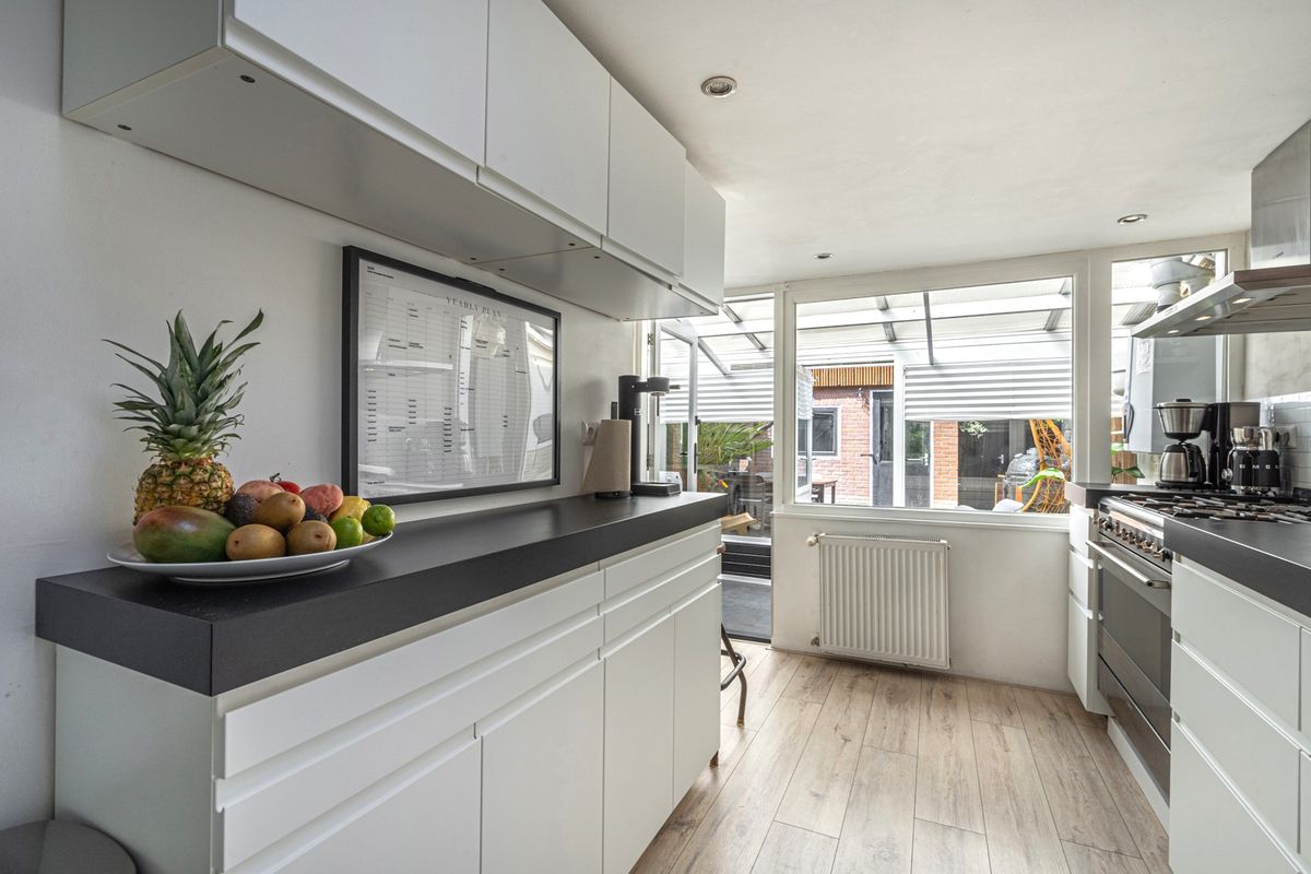 Aangrenzende keuken (ca. 9m2) voorzien van koel-/vriescombinatie, afzuigkap, oven en gaskookplaat;