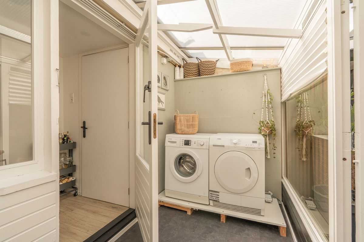 Aangebouwde serre met cv-installatie en aansluitingen voor wasmachine en droger.