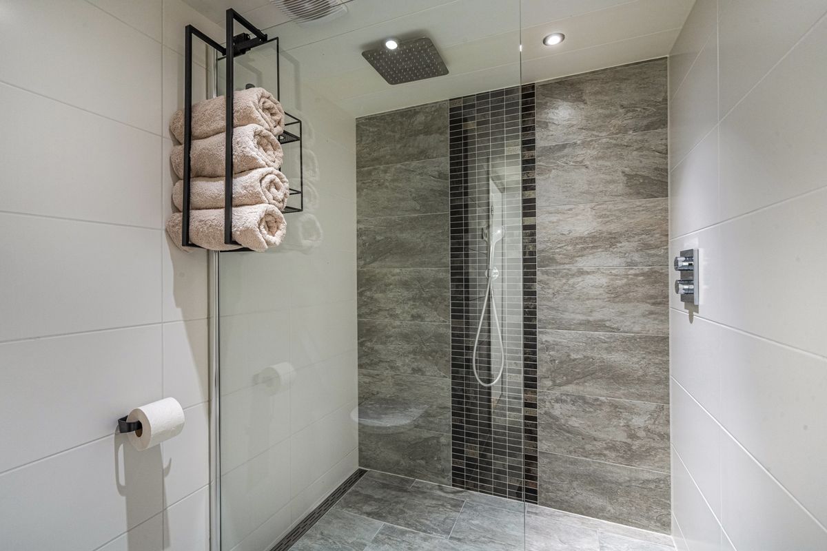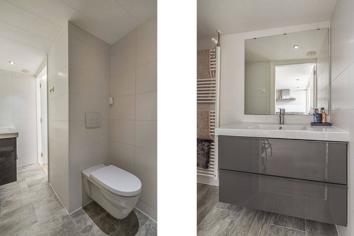 Moderne badkamer (ca. 5m2) met ruime inloopdouche, wasmeubel en toilet;