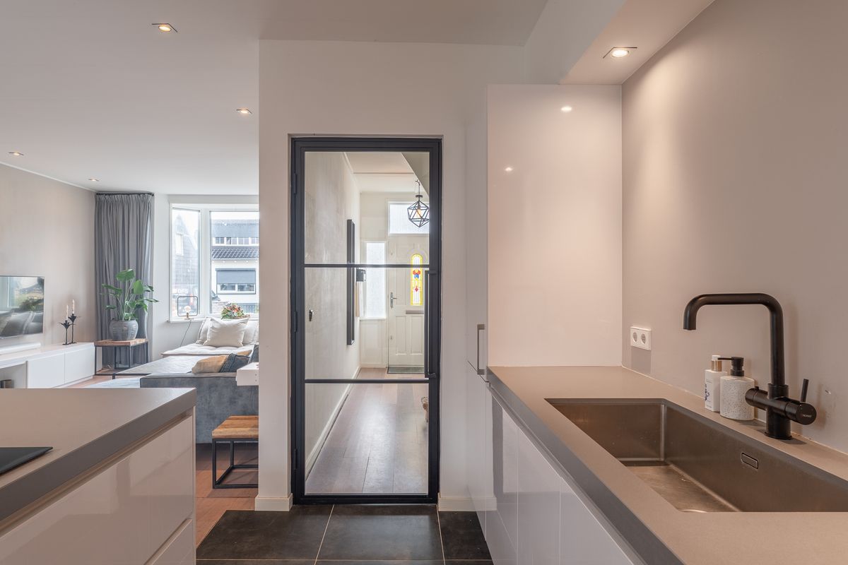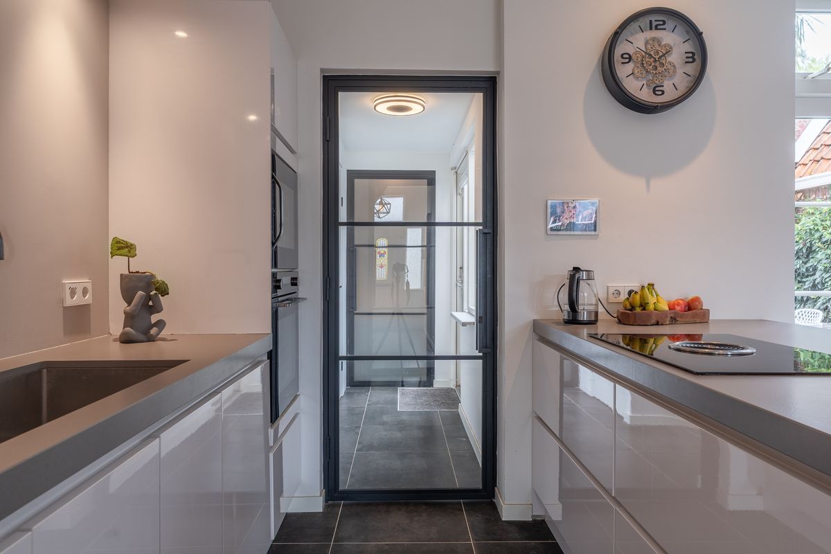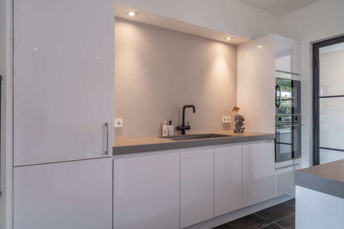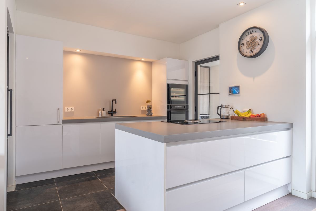 De open keuken is geplaatst in 2021 en uitgevoerd in een moderne kleurstelling met diverse inbouwapparatuur, waaronder een inductiekookplaat, combi-oven, vaatwasser en wijnklimaatkast. Vanuit de keuken is er toegang tot de praktische bijkeuken met wasmachineaansluiting, een separate toiletruimte en doorgang naar de badkamer.
