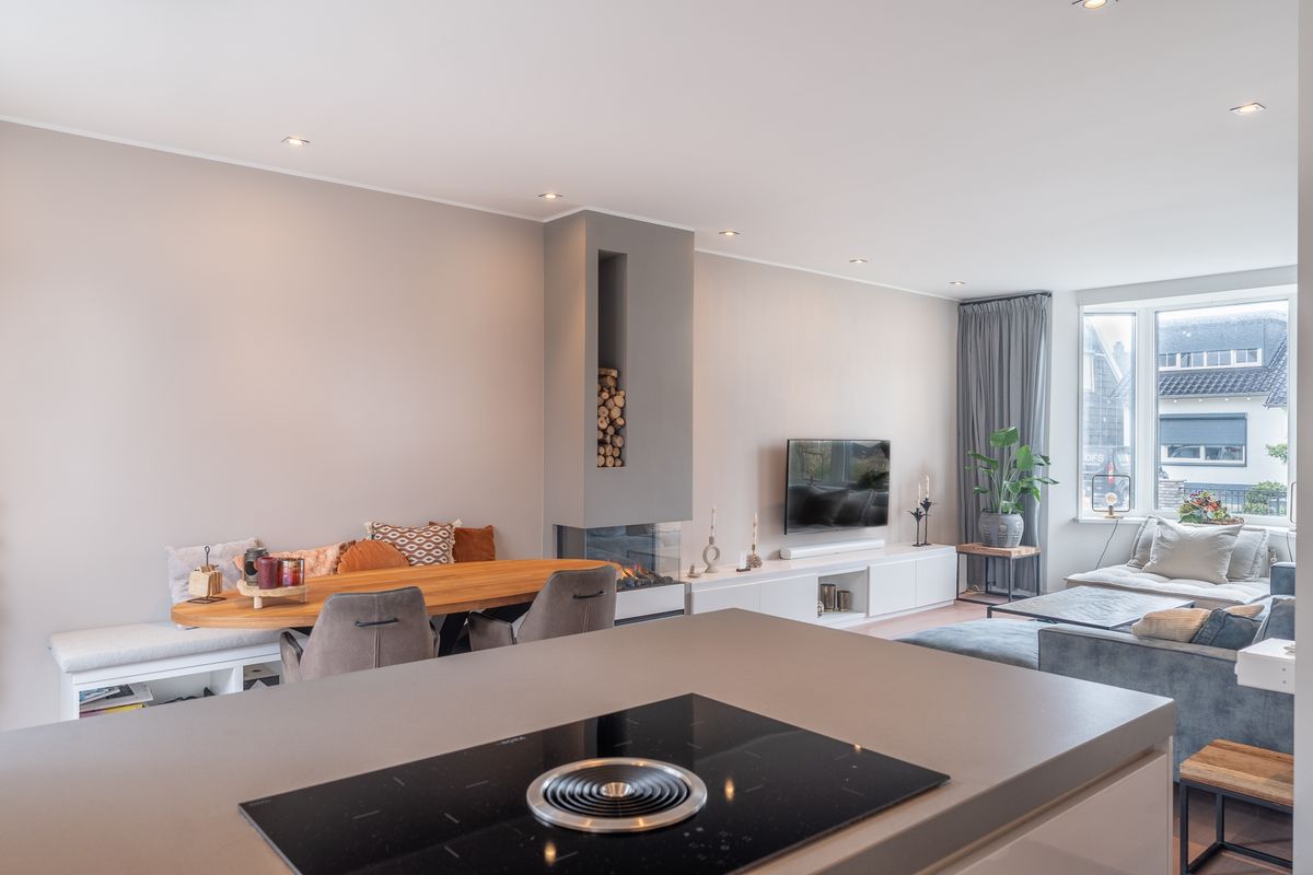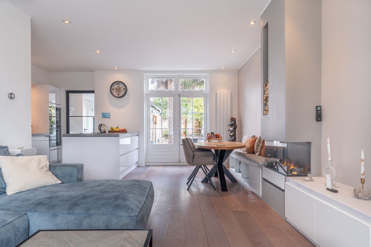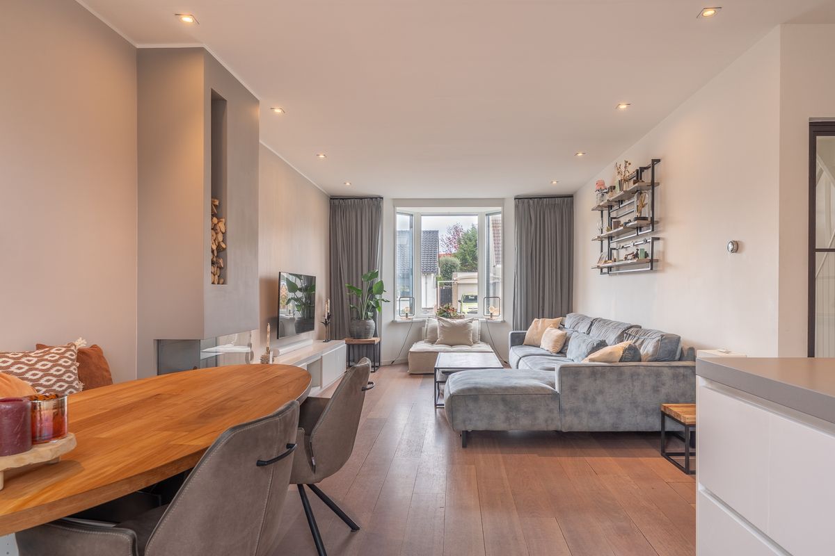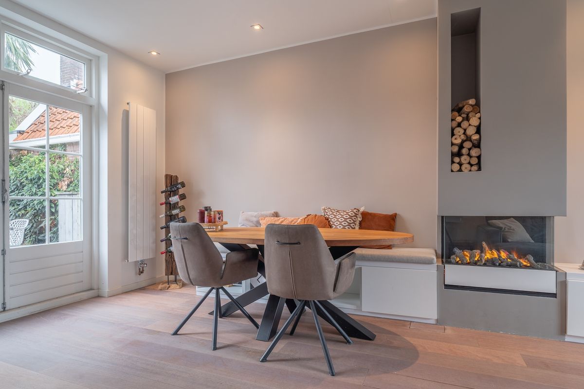 Entree met hal, meterkast en trapopgang naar de verdieping. Gezellige woonkamer met erker aan de voorzijde, wat zorgt voor een prettige lichtinval. De ruimte is voorzien van een sfeervolle waterdamphaard met bijpassend meubel en airconditioning. De wanden en plafonds zijn strak afgewerkt en op de vloer ligt een fraaie vloerafwerking met gedeeltelijke vloerverwarming.