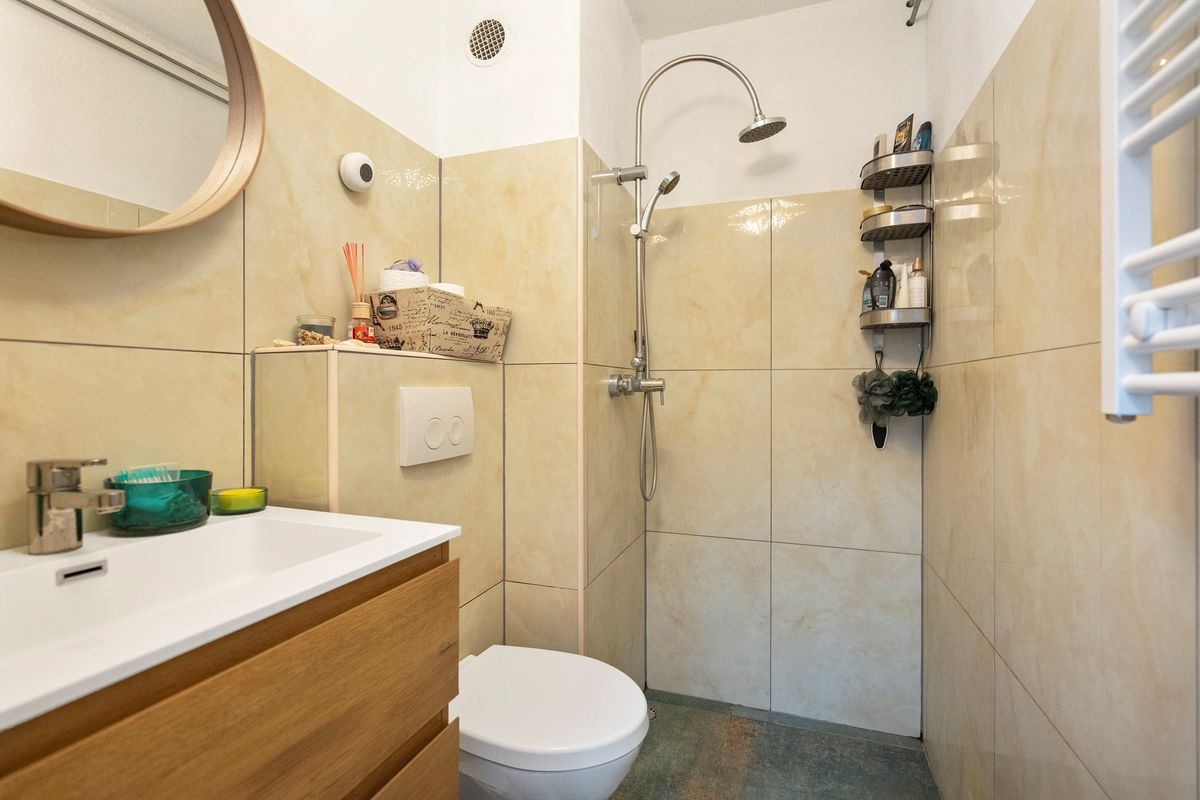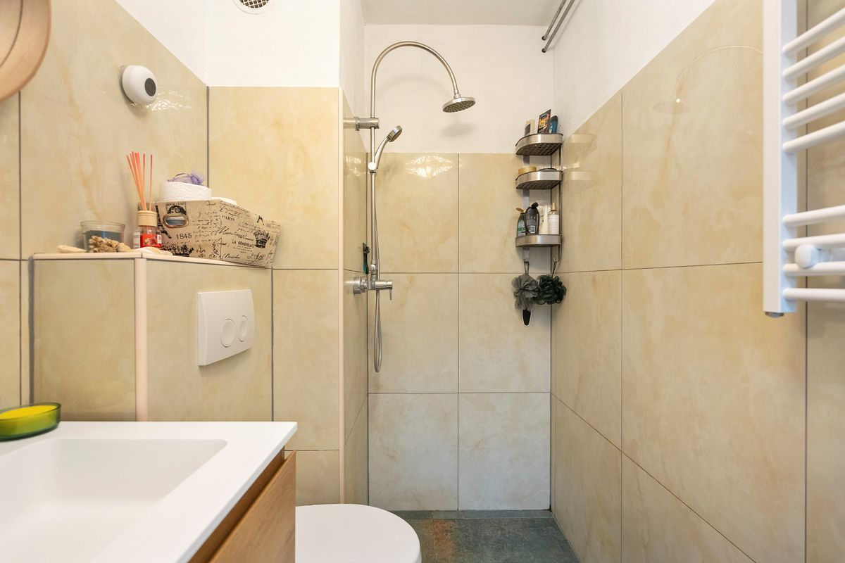On the fourth floor, you enter through the hallway, followed by a neat renovated (2022) bathroom with a shower, sink, and toilet. The bright living room with an open kitchen provides access to the sunny southwest-facing balcony. The kitchen is equipped with various built-in appliances such as a fridge-freezer combination, oven, and 4-pit gas cookingplate.