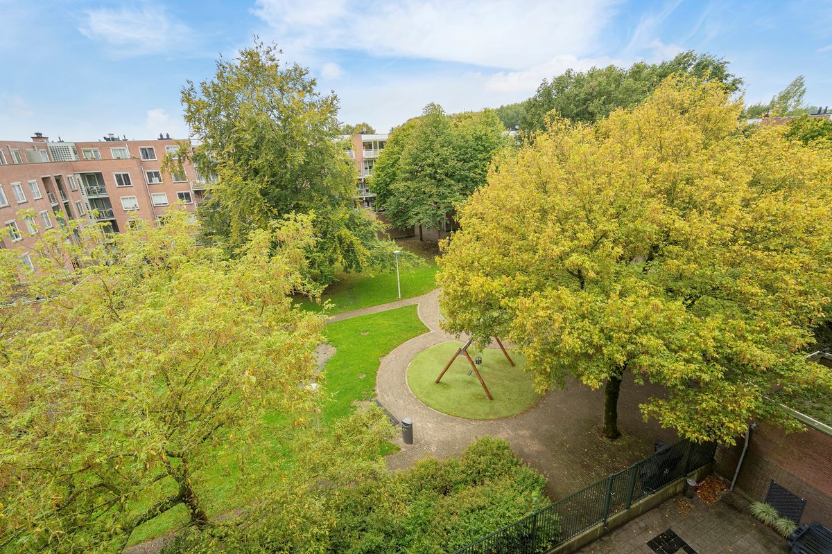 Balkon op het zuidwesten met vrij uitzicht op het parkje