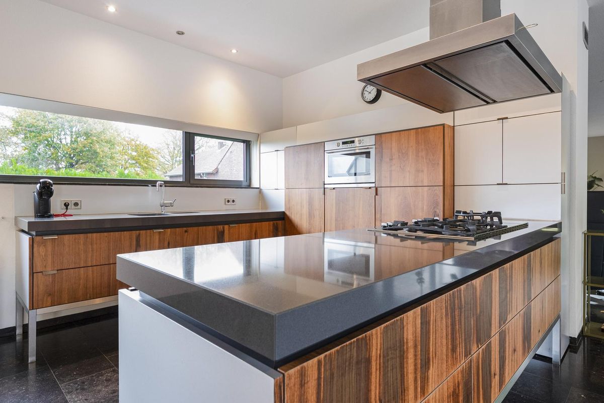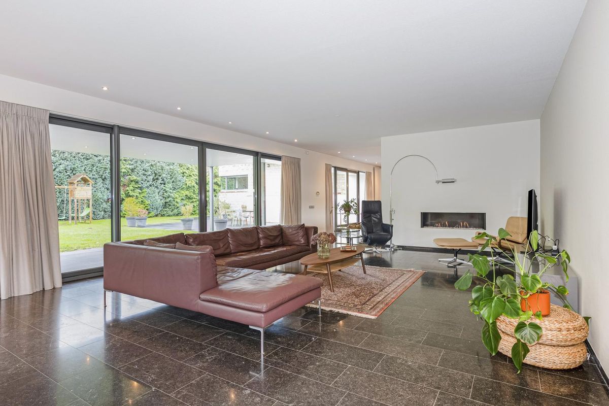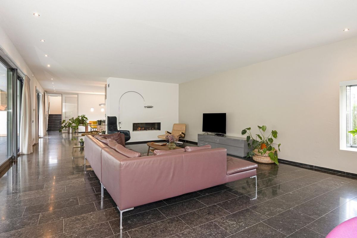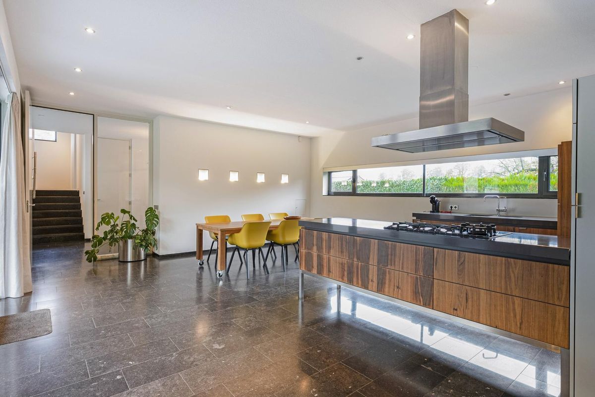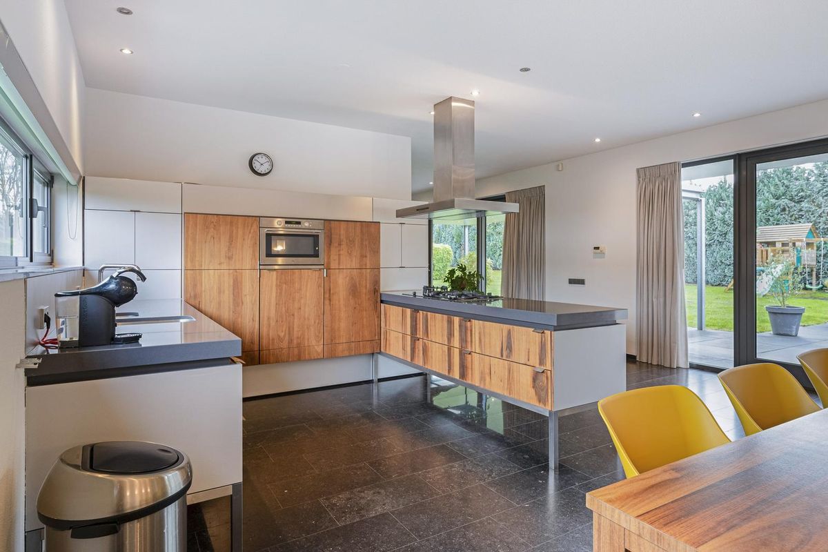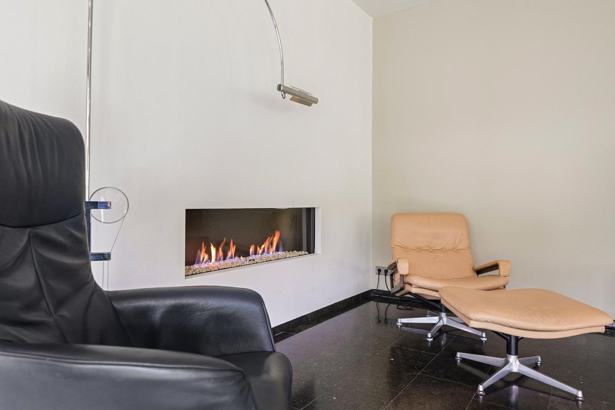 Vanuit de hal bereikt u de grote woonkamer van ruim 9 meter lang, voorzien van een sfeervolle gashaard en een brede schuifpui die direct aansluit op het terras. De halfopen keuken is uitgerust met een luxe, op maat vervaardigde keukencombinatie met gaskookplaat, combi-oven, afzuigkap, koelkast en vaatwasser. Woonkamer en keuken beslaan samen circa 85 m². Zowel de woonkamer als de keuken en hal zijn afgewerkt met prachtige Belgische hardstenen vloeren, wat de woning een luxe en tijdloze uitstraling geeft.